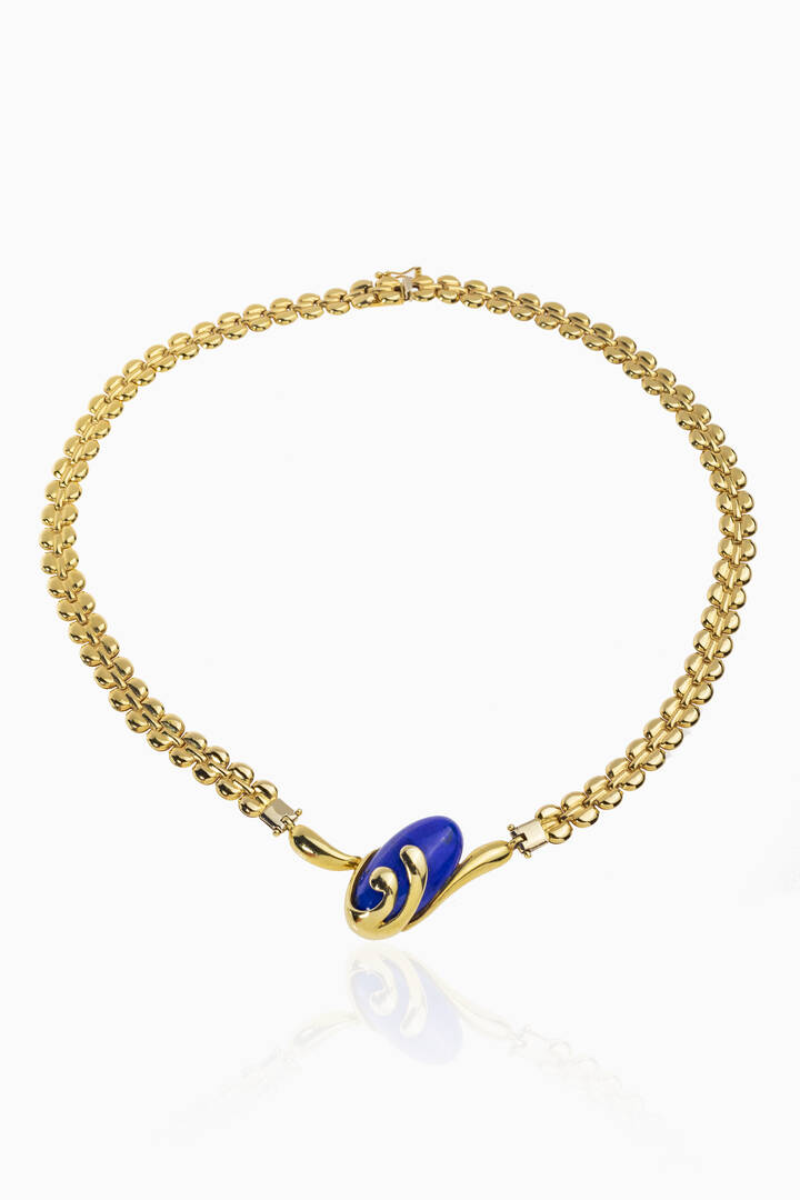 in oro giallo, anni '90, con maglia appiattita geometrica ed al centro ovale in lapislazzuli