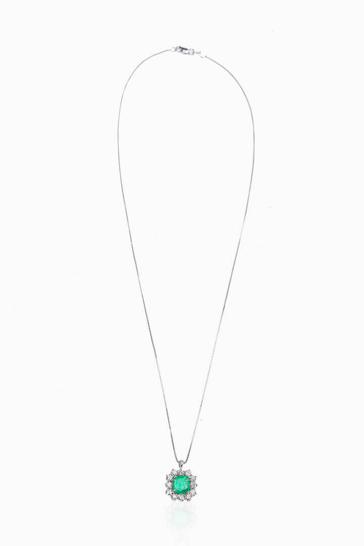 in oro bianco, con smeraldo taglio ottagonale a gradini di ct 0,90 ca, contornato da diamanti taglio brillante per totali ct 0,50 ca, probabile colore G-H, purezza VS-SI