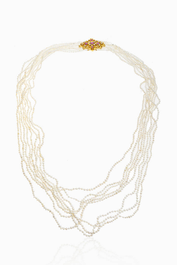 composta da otto fili di perline di acqua dolce del diam di mm 2-3, centro in oro giallo ad arabesco, con diamanti taglio vecchio per ct 1,50 ca e rubini taglio ovale per totali ct 1,20 ca