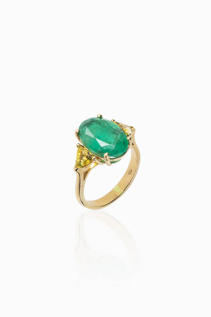 in oro giallo con uno smeraldo taglio ovale di ct 4,24 e due zaffiri gialli triangolari per totali ct 1,12 ca.
