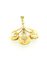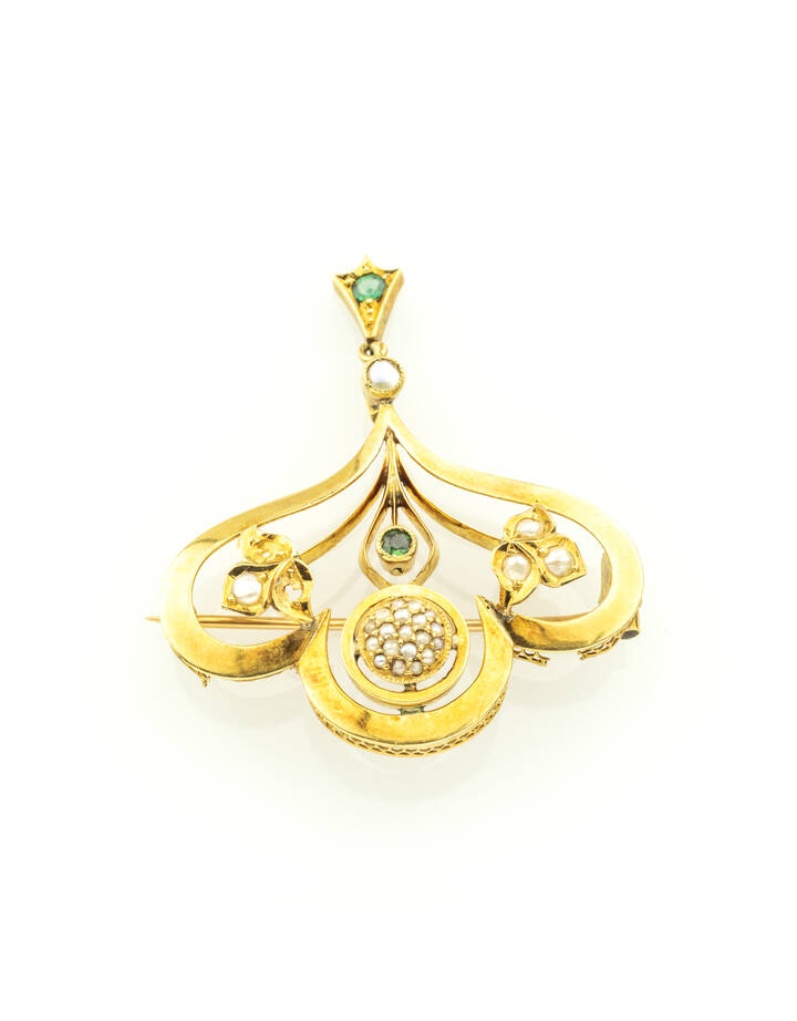 in oro giallo a bassa caratura, sommità a voluta, con piccole perline (due mancanti) e gemme verdi sintetiche
