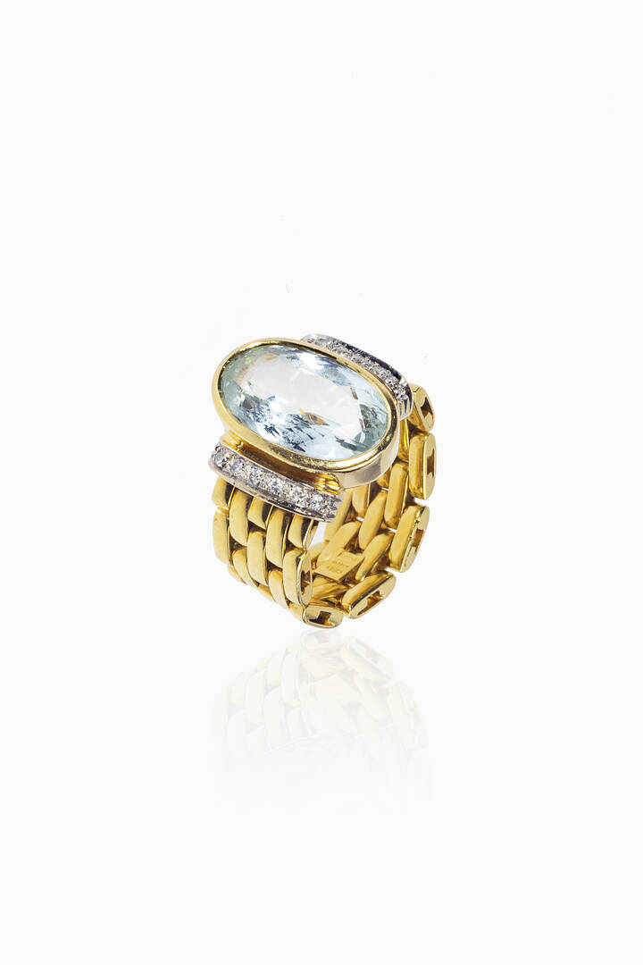 in oro giallo, gambo lavorato a maglia, al centro acquamarina taglio ovale e diamanti taglio brillante per totali ct 0,15 ca