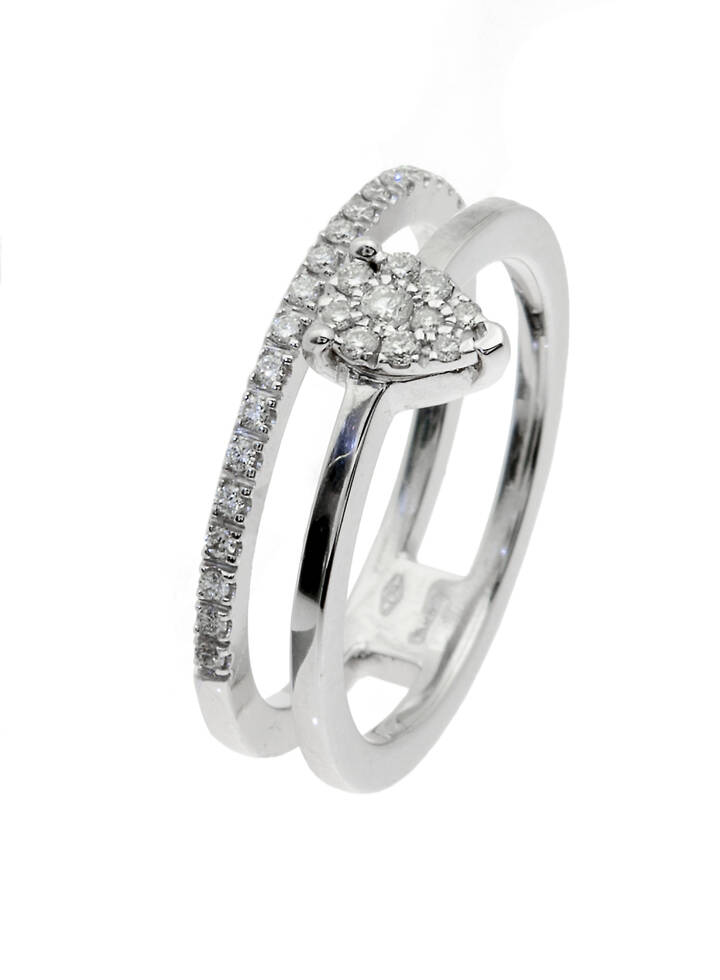 in oro bianco, composto da due fasce, una con diamanti taglio brillante, una con goccia in pavé di diamanti taglio brillante. Totali ct 0,23 ca