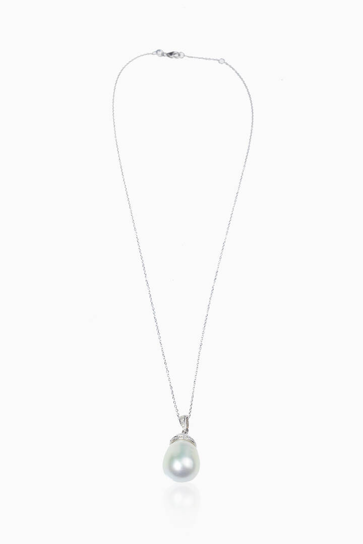 in oro bianco con grande perla australiana a pera del diam. di mm 14 ca; diamanti taglio brillante per totali ct 0,20 ca, probabile colore G-H, purezza IF-VVS