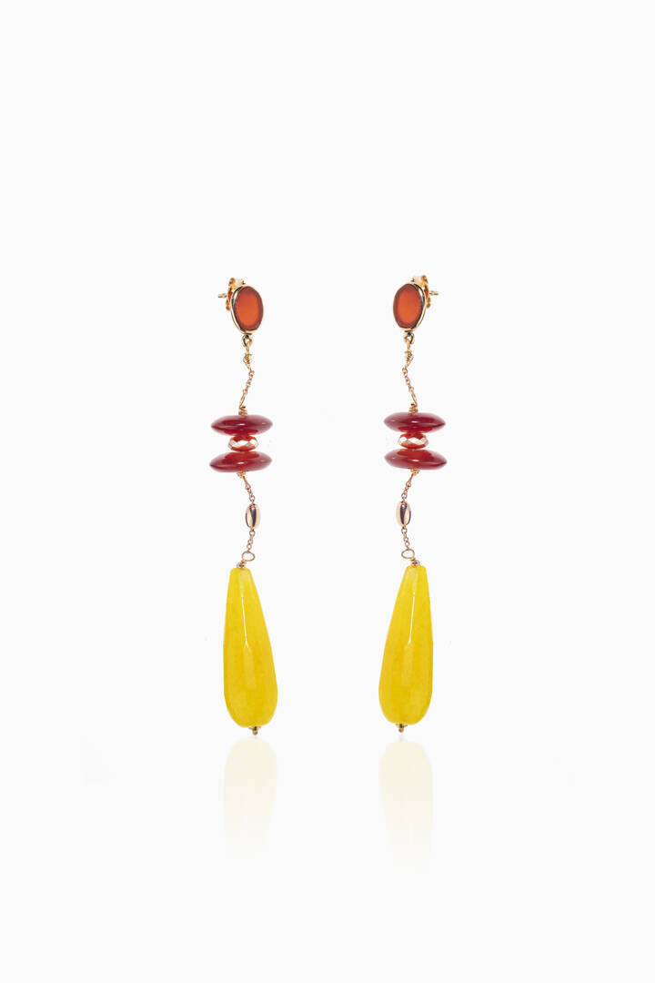 pendenti, in oro rosa, con dischi in corniola e gocce in giadeite gialla.
