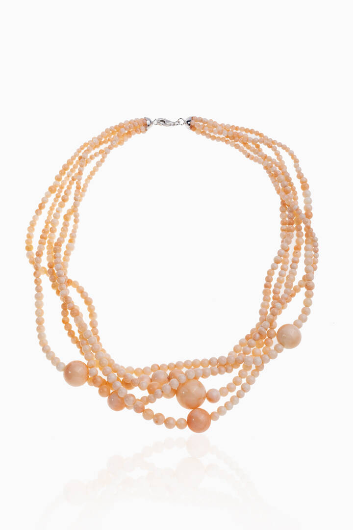 composto da cinque fili di sfere di corallo rosa mediterraneo dal diam. di mm 3,3 a 14,7. Chiusura a moschettone in argento.