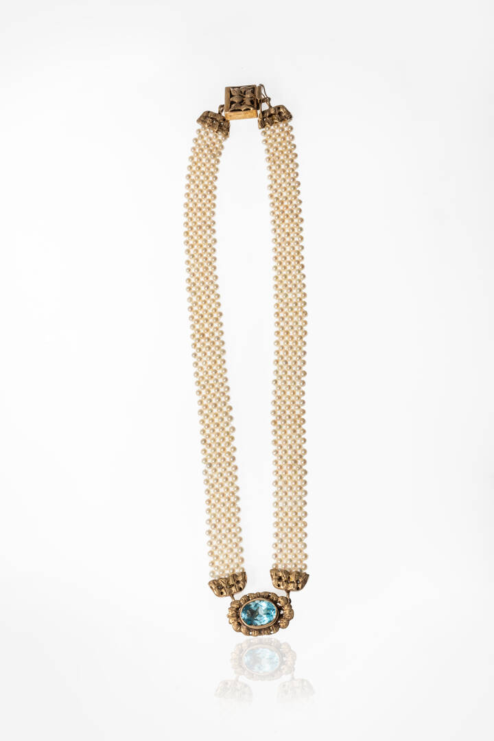 composto da perle giapponesi lavorate a tessuto; al centro topazio azzurro taglio ovale. Chiusura e castone in oro a bassa caratura.