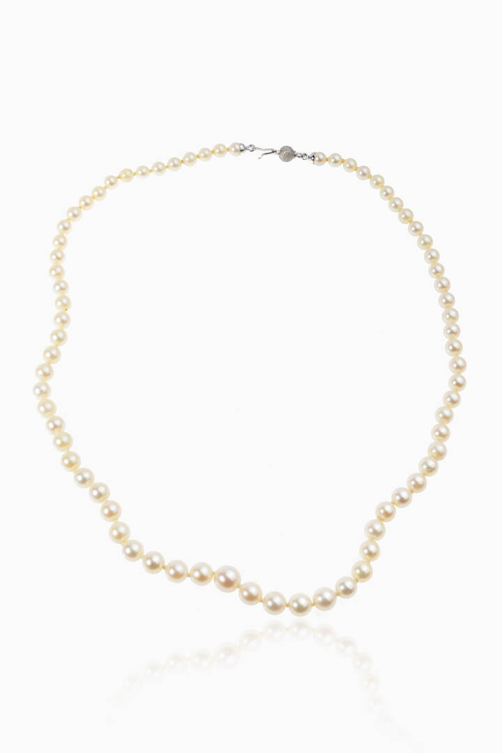 composto da un filo di perle giapponese a scalare dal diam. di mm 5,7 a 8,6 ca. Chiusura satinata, a sfera, in oro bianco