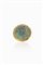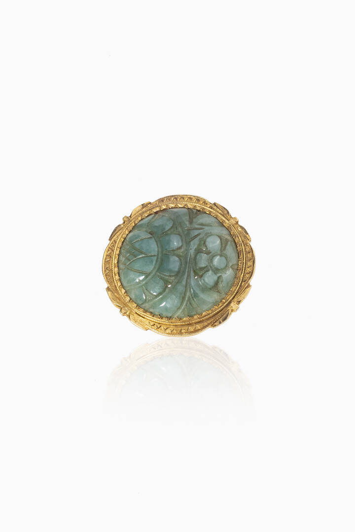 ciondolo-spilla in oro giallo e giada incisa a motivi floreali.