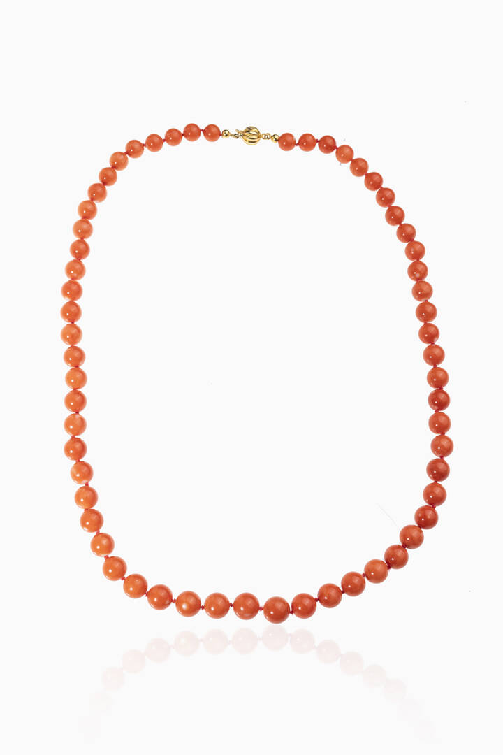 composta da un filo di sfere di corallo giapponese color salmone del diam. di mm 8,5-9, Chiusura in oro giallo a sfera fesonata.