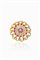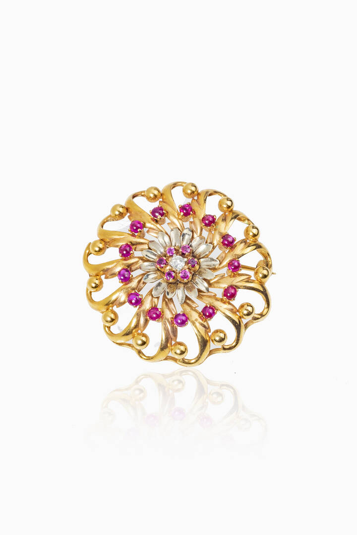 in oro giallo e bianco, anni '40, di forma rotonda con intreccio; al centro rubini cabochon e un diamante taglio brillante al centro di ct 0,07 ca