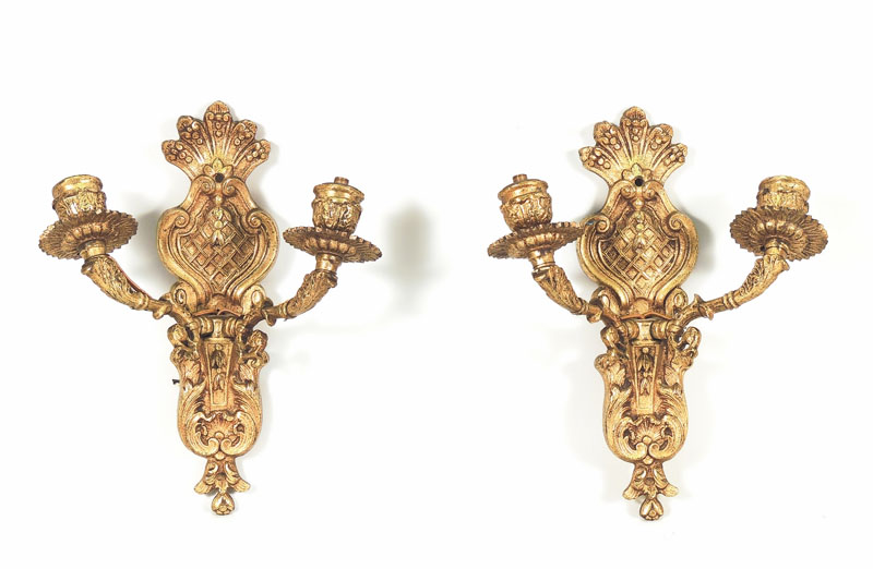 COPPIA DI APPLIQUES IN BRONZO DORATO due bracci portacandela a voluta h cm 28,5 PAIR OF GILDED BRONZE WALL LAMPS