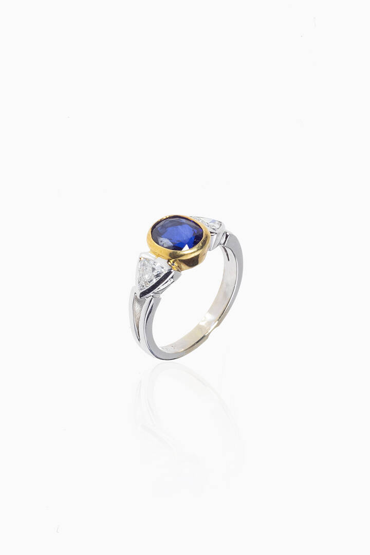 in oro bianco e giallo al centro zaffiro taglio ovale di ct 1,30 ca ed ai lati due diamanti taglio triangolare per totali ct 0,50 ca, probabile colore G-H, purezza VS