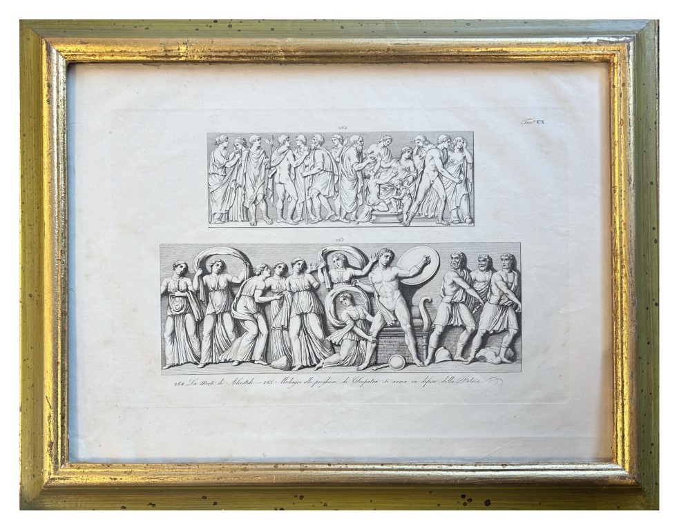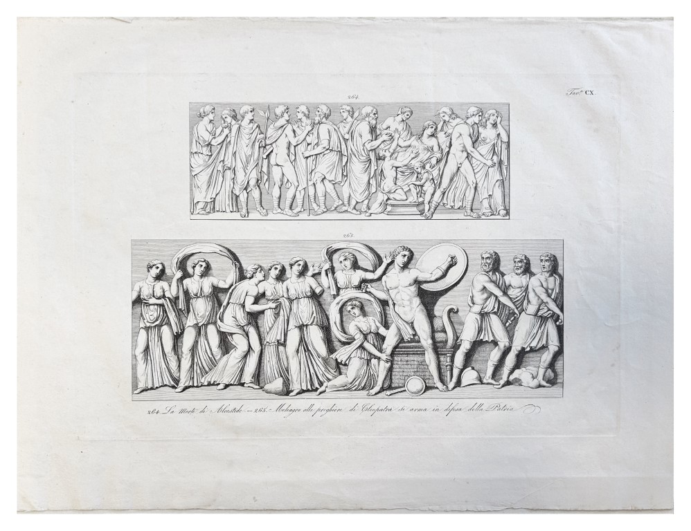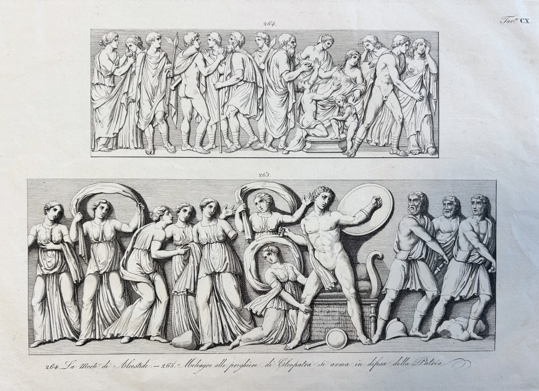 Incisione con le scene di 'La morte di Alcestide' e 'Meleagro alle preghiere di Cleopatra si arma in difesa della patria'