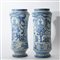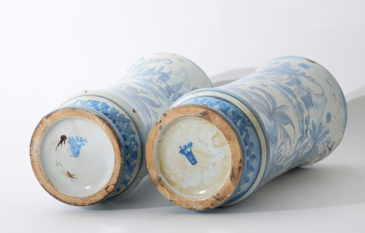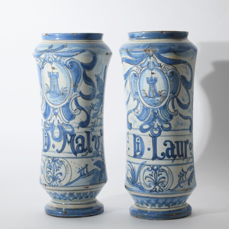 Coppia di piccoli albarelli tipo Savona in maiolica policroma