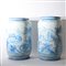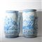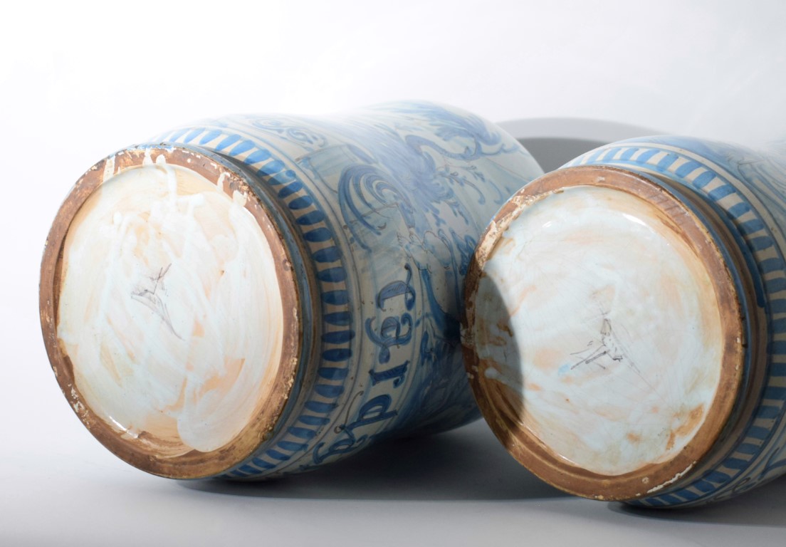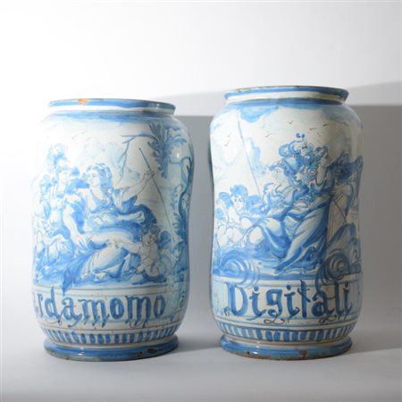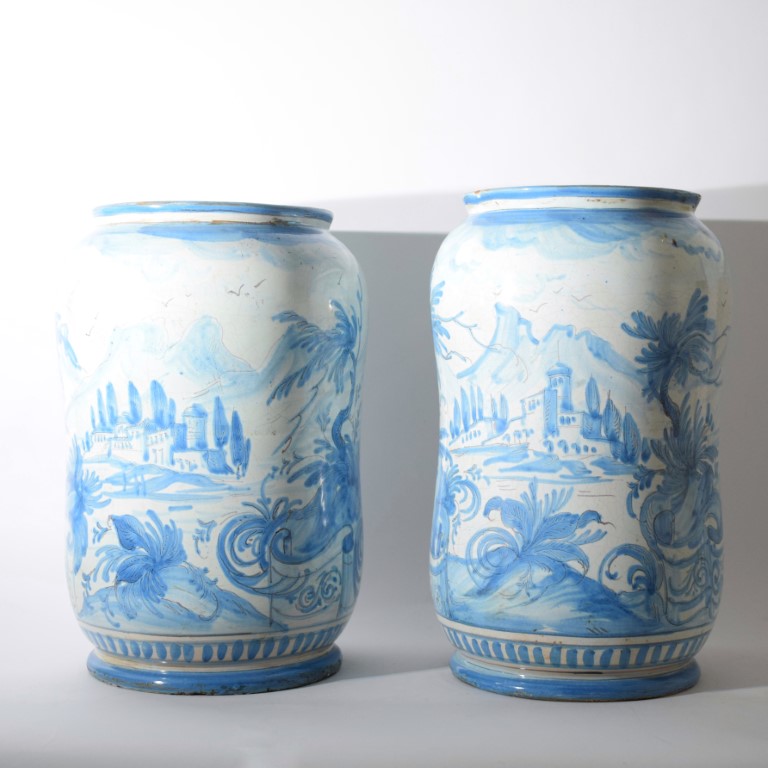 Coppia di grandi albarelli tipo Savona in maiolica policroma