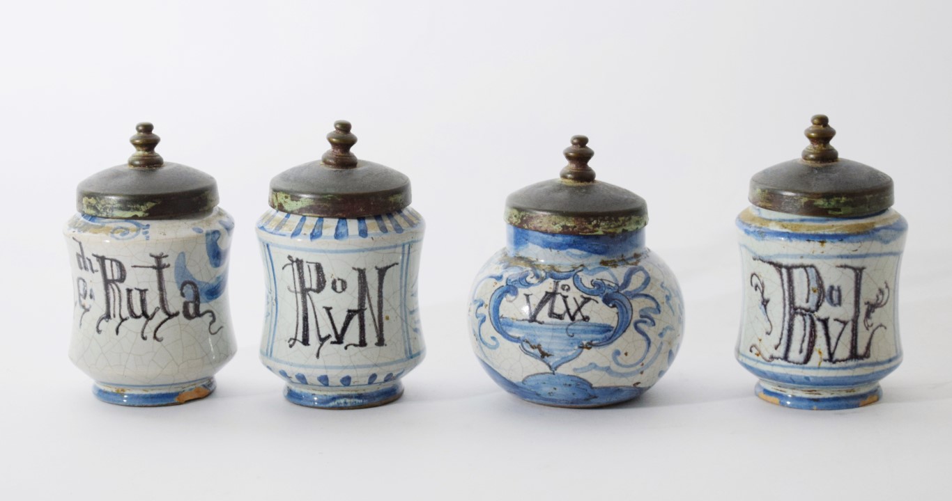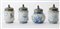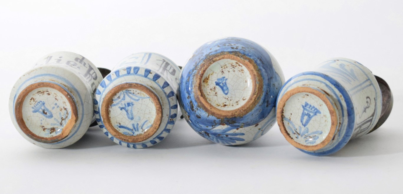 Quattro piccoli contenitori da farmacia tipo Savona in maiolica policroma