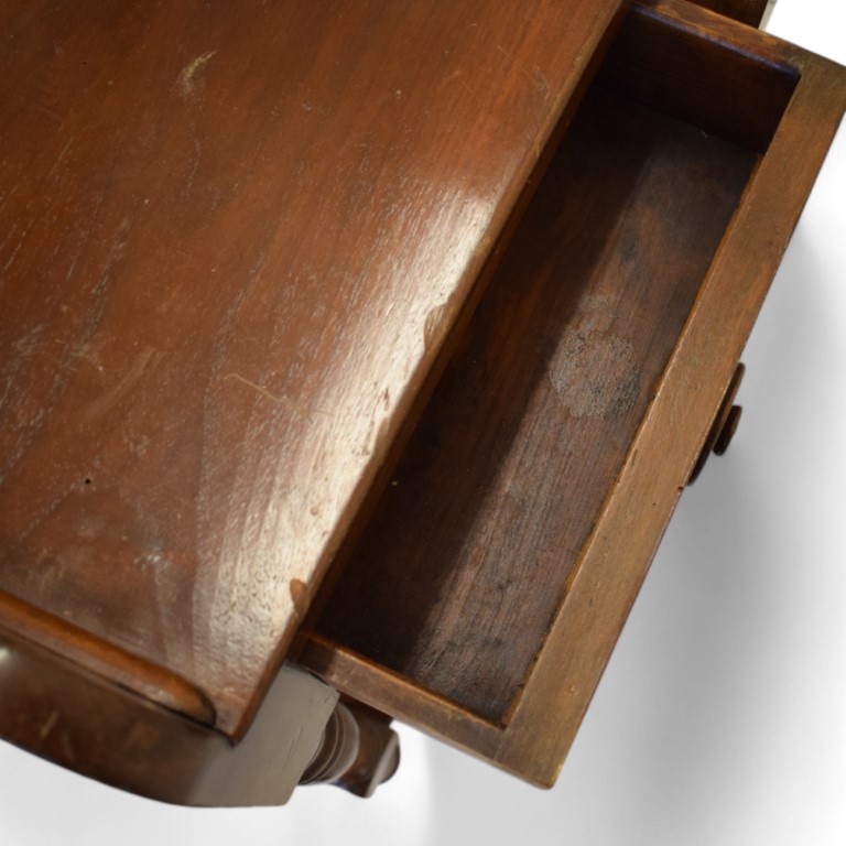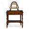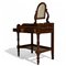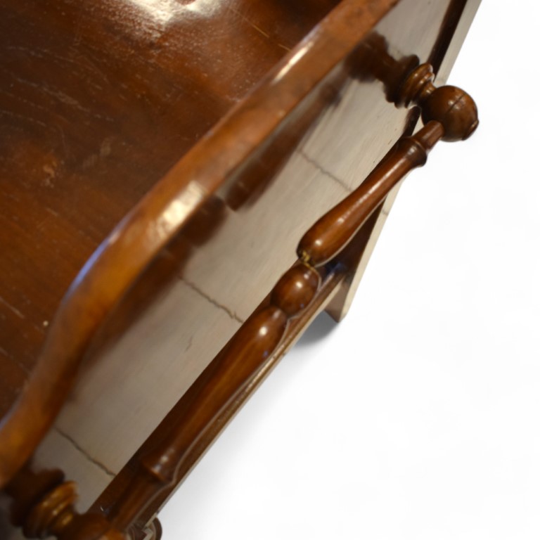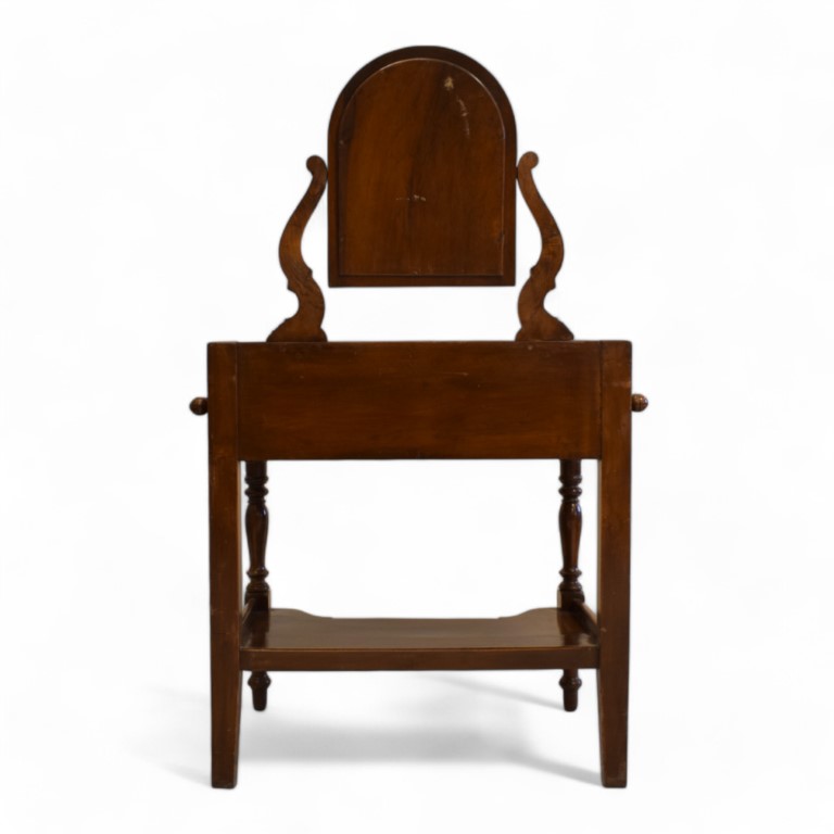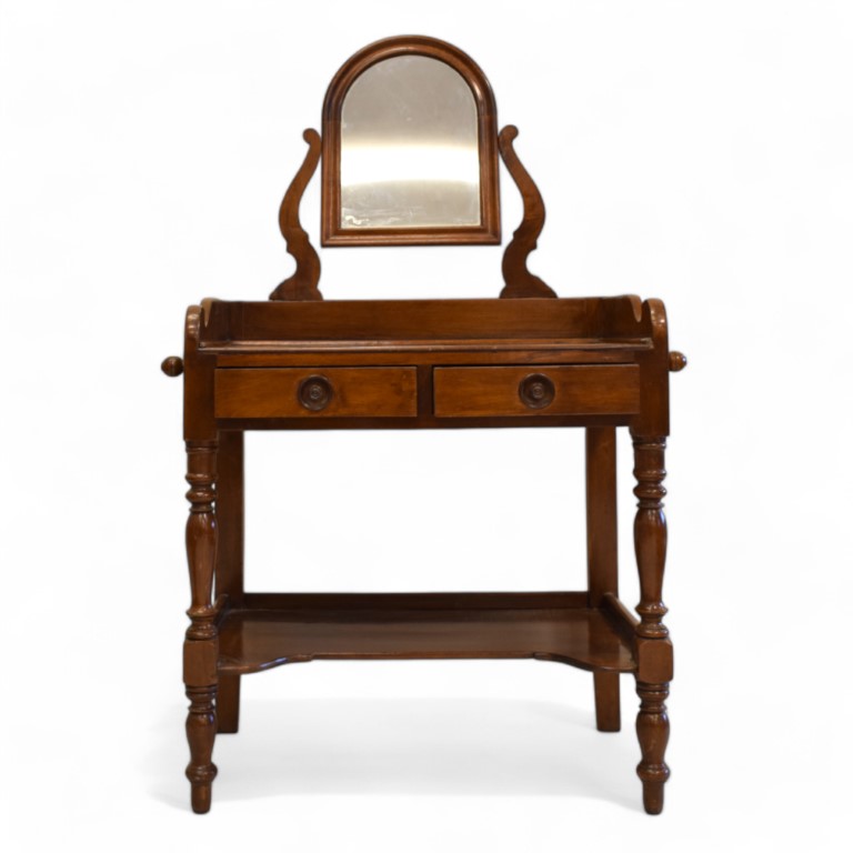 Specchiera bilico su sostegni a voluta, piano rettangolare con due cassetti nella fascia, gambe tornite e sottopiano sagomato, sostegni laterali per gli asciugamani