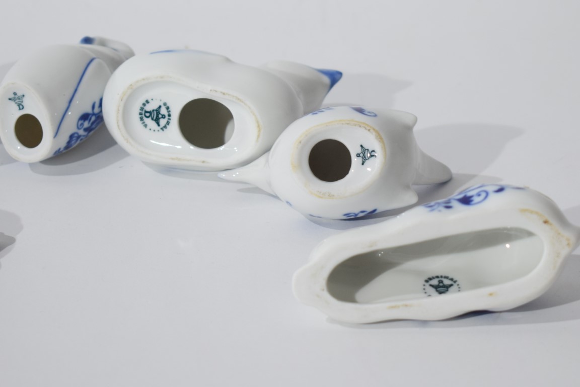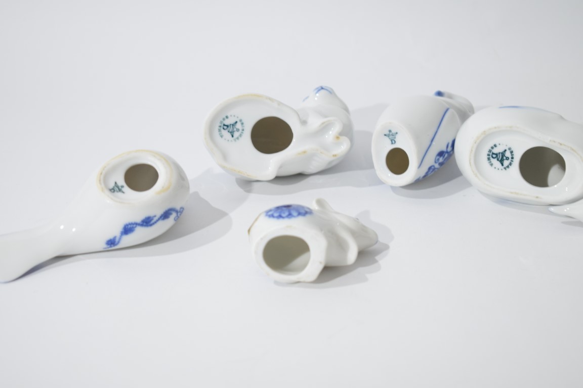 Sette statuette di animali in porcellana bianco blu, Manifattura Royal Dux
