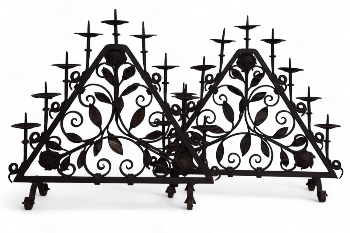 Due grandi candelabri in ferro battuto di forma triangolare A nove fiamme...