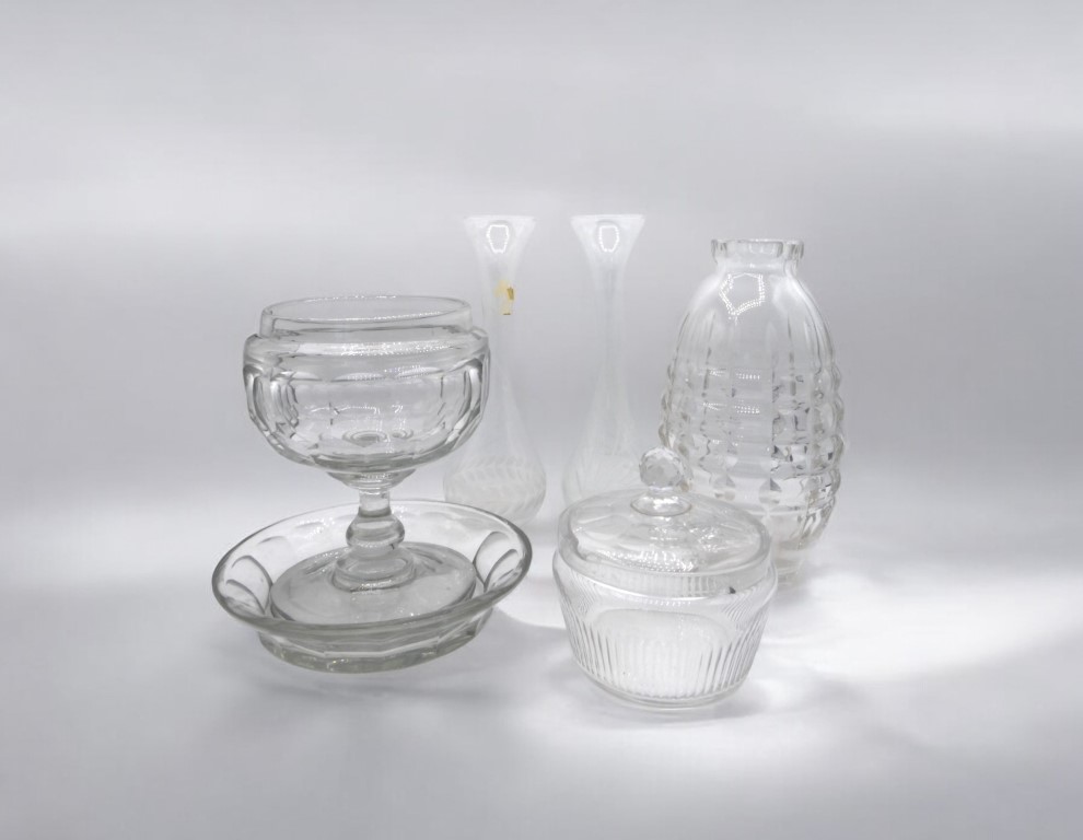 composto da: tre vasetti in vetro molato, scatolina in cristallo molato con coperchio, un centrotavola antico a coppa con piatto in vetro molato e sfaccettato