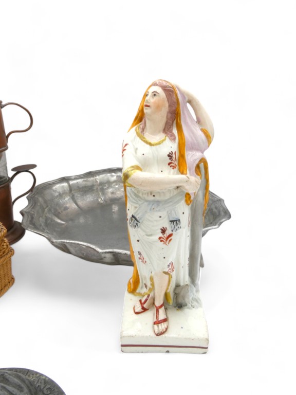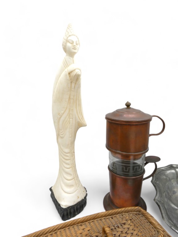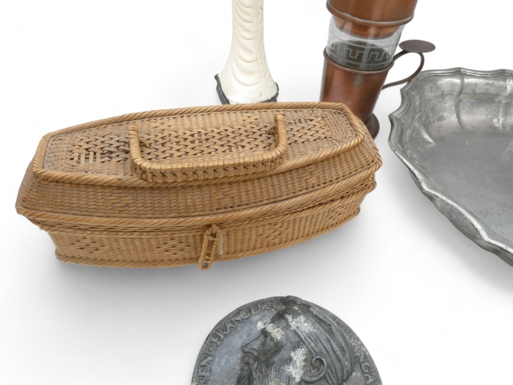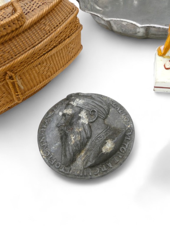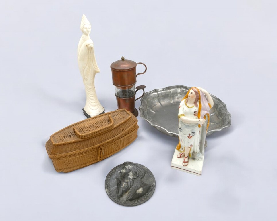 composto da: antico centrotavola sagomato in peltro argentato, figura femminile vestita all'antica con ancora in maiolica XIX secolo, statuetta orientale in marmo bianco su base in marmo nero, piccolo cestino con coperchio in paglia, tazza da tisane in rame e vetro, medaglia raffigurante Francesco da Sangallo