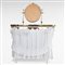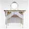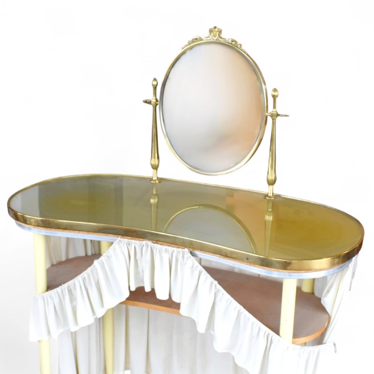 Specchio a bilico sorretto da colonnine tornite, piano sagomato a fagiolo, ricoperto in vetro, sotto piano sagomato, gambe affusolate, completa di tendine in cotone bianco.
