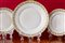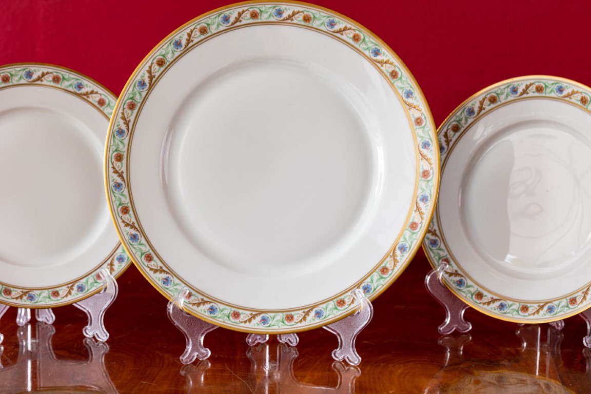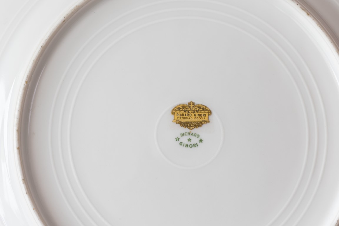 decorati a festone di fiori sulla tesa su fondo bianco, composto da 6 piatti e 1 vassoio circolare