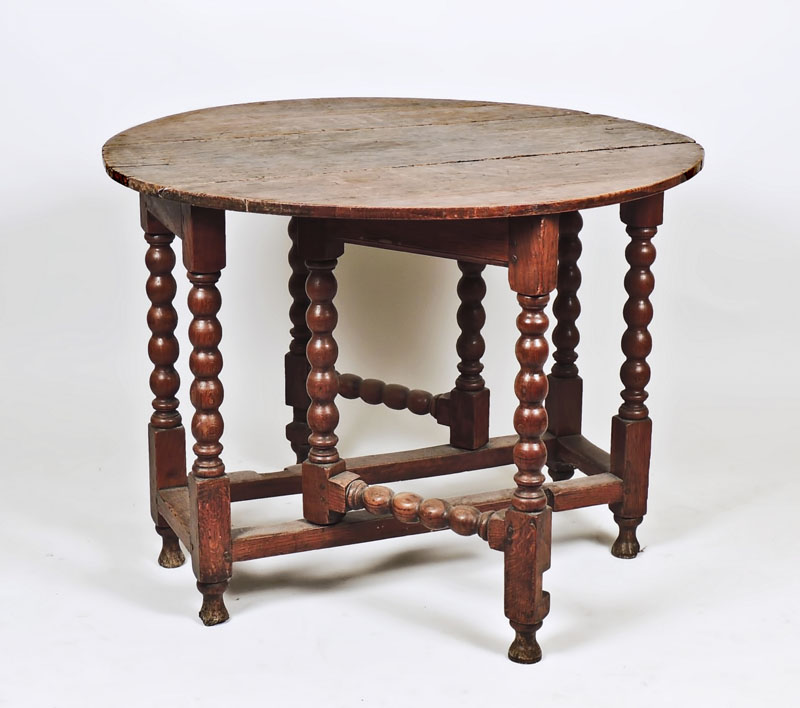 TAVOLINO A BANDELLE IN ROVERE sostegni a rocchetto riuniti da traverse, piedi torniti, aperto h cm 73, diam cm 96 OAK DROP-LEAF TABLE