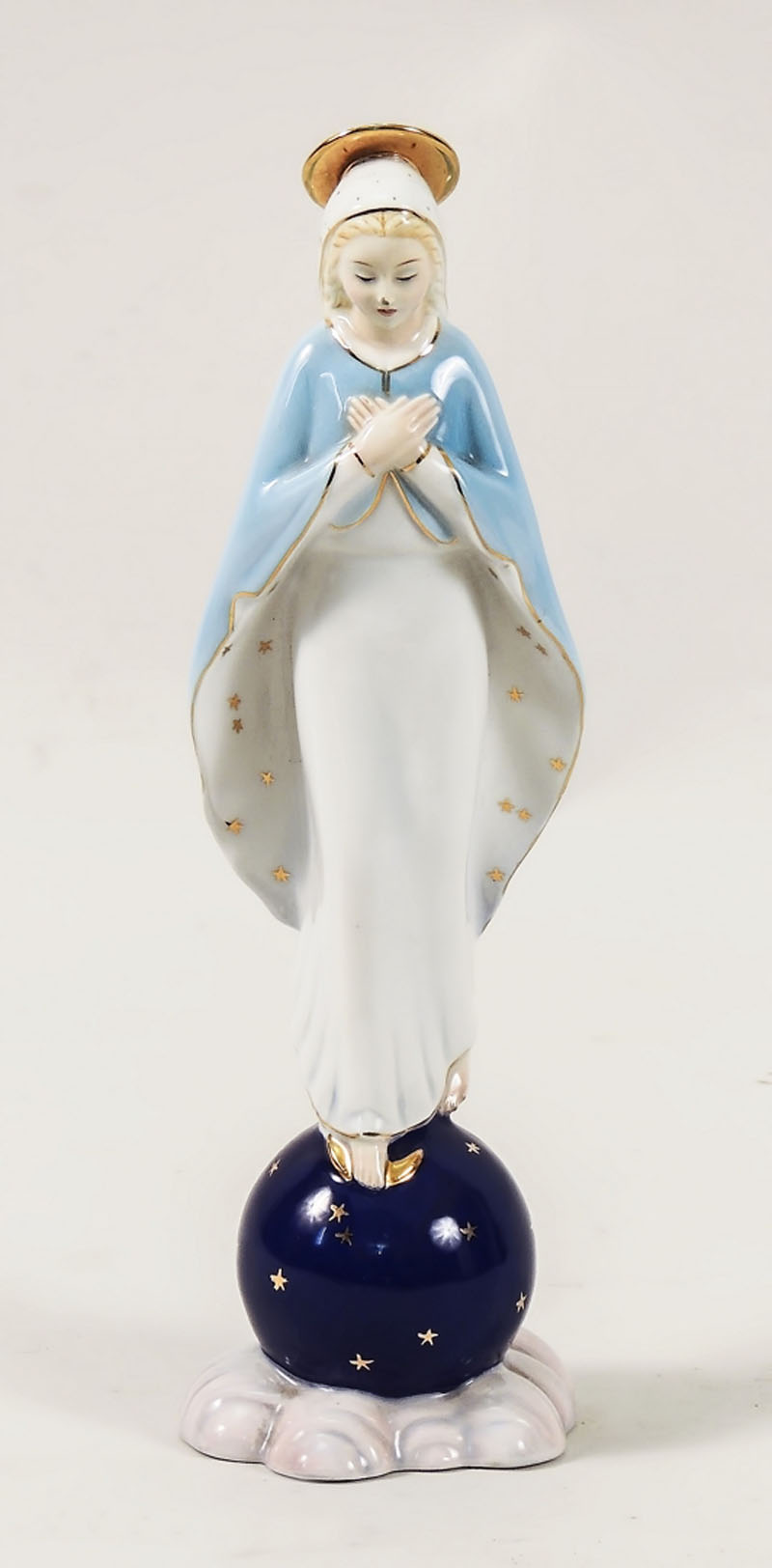 GRUPPO IN CERAMICA Ronzan raffigurante Madonna su globo celeste, dipinta nei toni del celeste e del blu e lumeggiata in oro h cm 25,5 Marcata sotto la base: Ronzan - Made in Italy - 108/2 CERAMIC RONZAN FIGURAL GROUP
