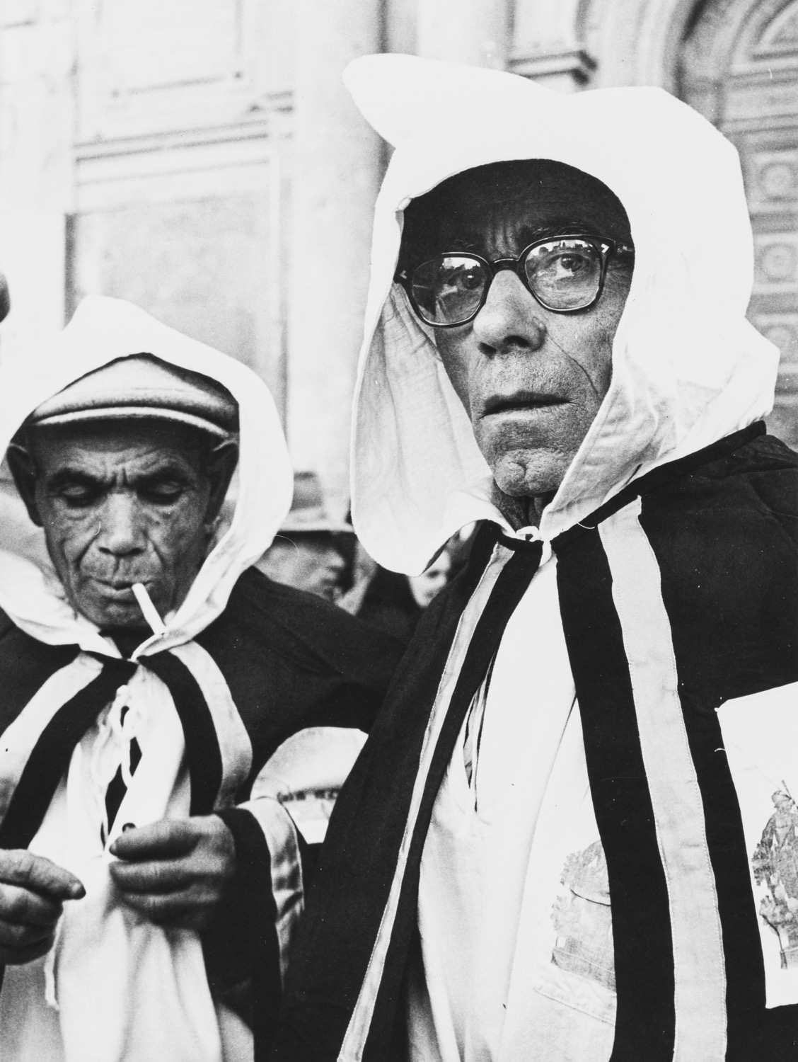 Le due fotografie qui proposte appartengono alla prima fase della ricerca di Camisa, quella in cui si dedica con rigore non disgiunto da originalità al ritratto. I diversi viaggi compiuti nel Meridione e nell’Africa del Nord lo mettono in contatto con realtà diverse che interpreta con uno stile asciutto volutamente lontano dalla retorica che negli anni ’50 aveva libera circolazione perché, si sa, i poveri sono più fotogenici e le greggi al pascolo fanno tanto folclore a buon mercato. La ripresa del primo piano del pesce spada che si allunga sul pavimento ci porta direttamente a osservare la donna e il bambino scalzi e seduti sulla bilancia su cui la preda verrà pesata: entrambi imbarazzati, molto raccontano del loro mondo silenzioso e antico. Più diretti, orgogliosi nei loro costumi sono, invece, i membri di una Confraternita: uno si accorge del fotografo cui regala uno sguardo curioso, mentre l’altro viene colto nell’attimo in cui, pensoso, si accende una sigaretta.