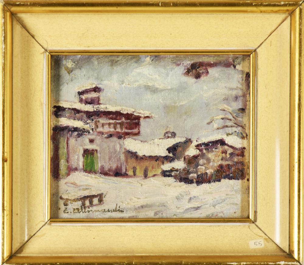 Enrico Allimandi PAESE DI MONTAGNA olio su cartone, cm 15x18 firma sul retro:...