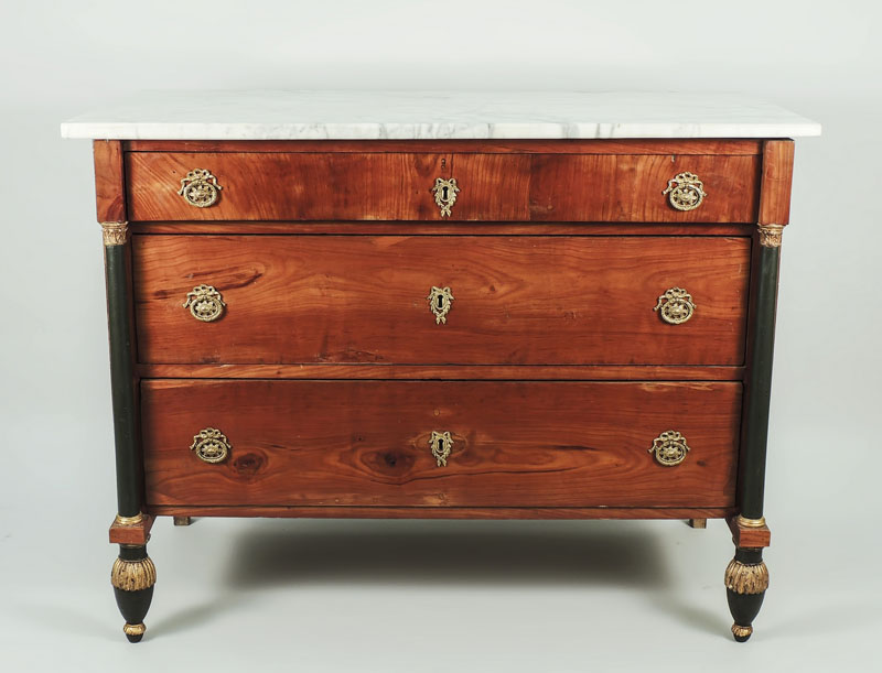 CASSETTONE IN NOCE XIX secolo tre cassetti sul fronte, colonne laterali in legno laccato e in parte dorato, applicazioni in bronzo dorato, piedi a pigna, piano in marmo bianco non pertinente, difetti h cm 96x124x58,5 WALNUT CHEST OF DRAWERS, 19TH CENTURY