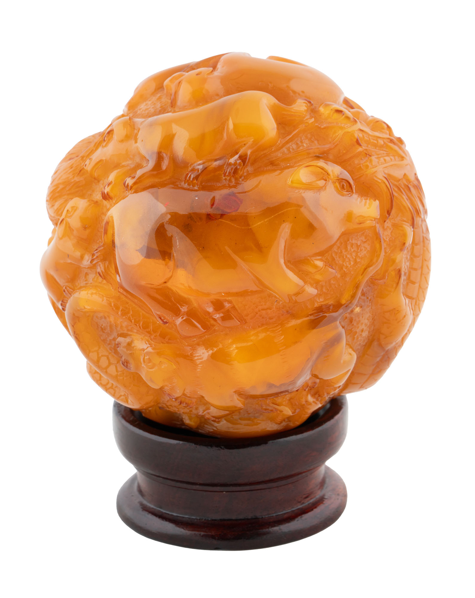 Arte cinese, Globo in resina color ambra con zodiaco cinese. XX secolo. Sfera in resina color ambra con raffigurati tutti i segni dell'oroscopo cinese (Topo, Bue,Tigre, Coniglio, Drago, Serpente, Cavallo, Capra, Scimmia, Gallo, Cane, Maiale). Su base cilindrica in legno. Ø cm 9. Base Ø cm 5. (1)