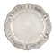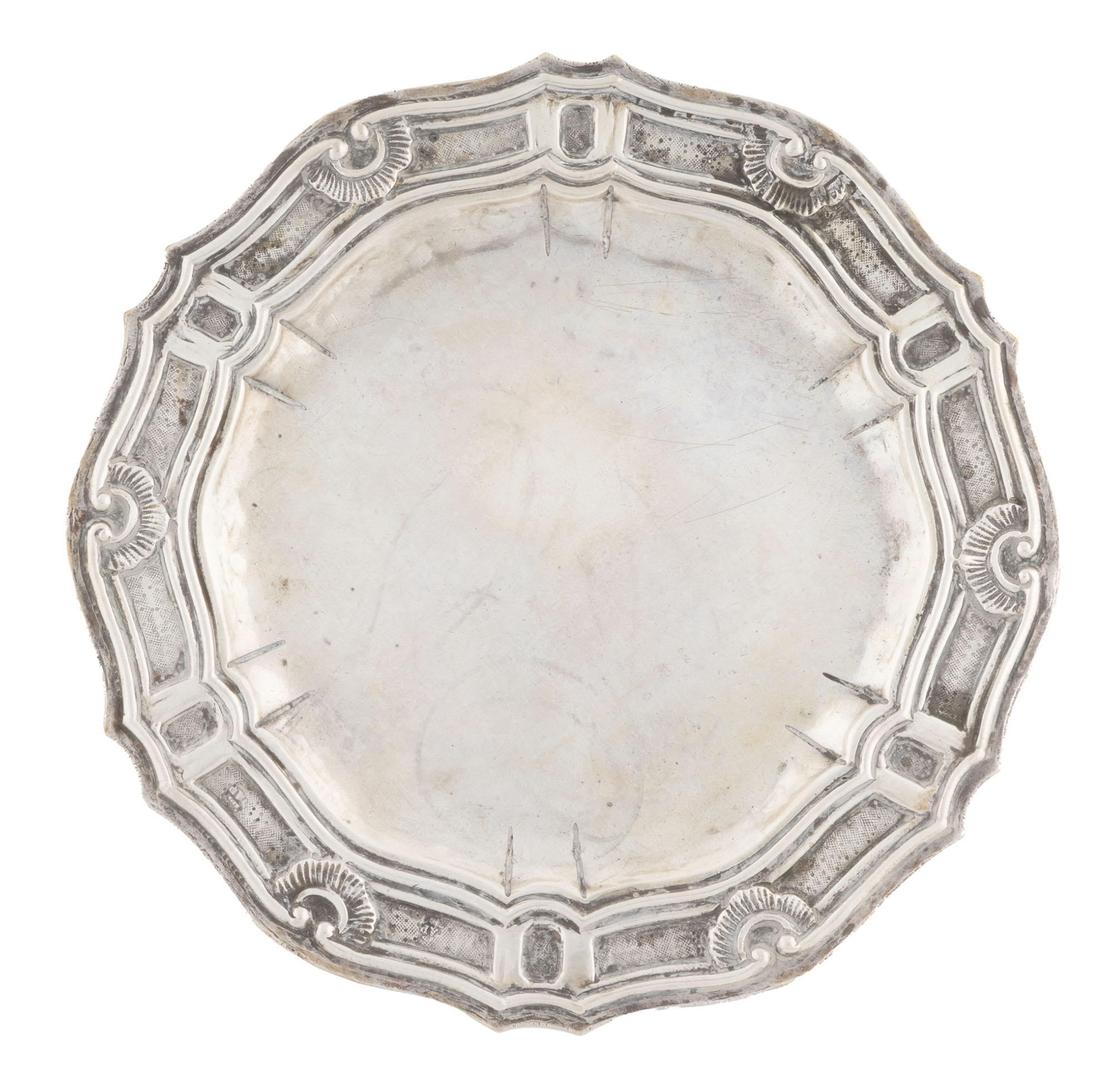 Italia, XVII secolo, Antico piatto rotondo con tesa sagomata e decorata. Regno di Napoli, 1619-1680 ca. Piccolo e antico piatto in argento con decorazione a sbalzo e cesello alla fascia sul bordo. cm 20,3x20,3. gr. 239. In uno degli scomparti della fascia di decoro punzone del Regno di Napoli con lettere "NAP sormontate da corona", (anni 1619-1680 ca.), ripetuto nello scomparto adiacente con le sole lettere "AP su numero 10 (?)". (1)Segni d'uso.