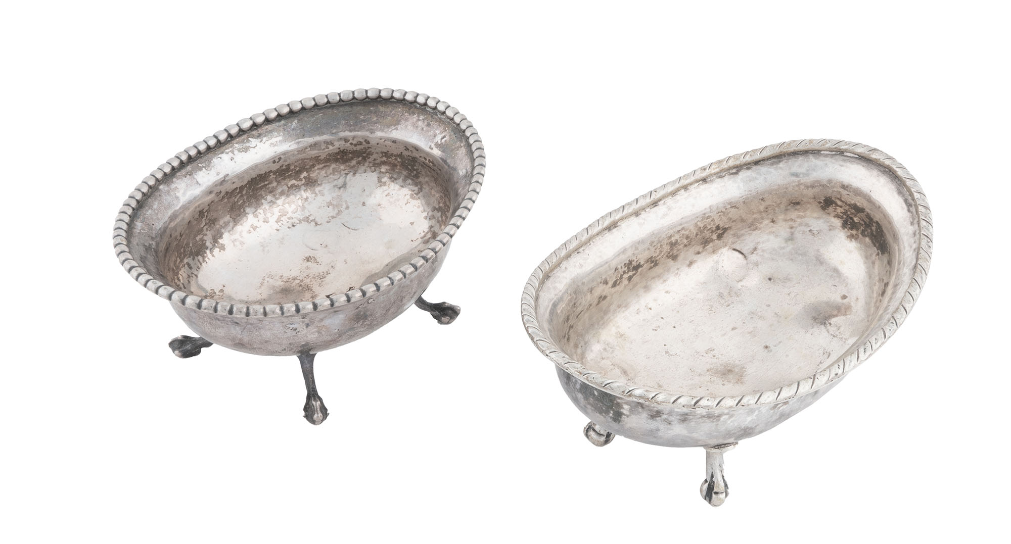 Italia, fine XVIII secolo, Coppia di vaschette in argento con bordo godronato su piedini alti con finale a zampa di leone. Venezia e Verona, 1780 ca. Coppia di vaschette in argento a corpo liscio con bordo godronato su piedini a zampa ferina. cm 8,8/9x12/13,5x6 h. gr.275 complessivi. Una con al verso punzone con leone di San Marco ripetuto due volte e marchio con lettere "N.P". L'altra sul fondo al recto presenta lo scudo con croce della città di Verona. (2)Segni d'uso.