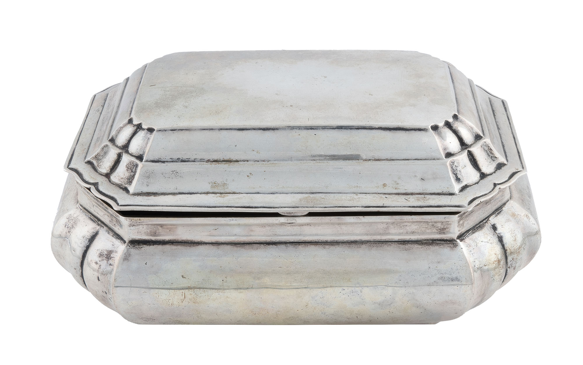 Lotto 68 | Johann Sigmund Kurz & Co, Hanau 1818 - 1960 ca., Scatola ottagonale in argento su modello antico con coperchio incernierato. 1900-1940.