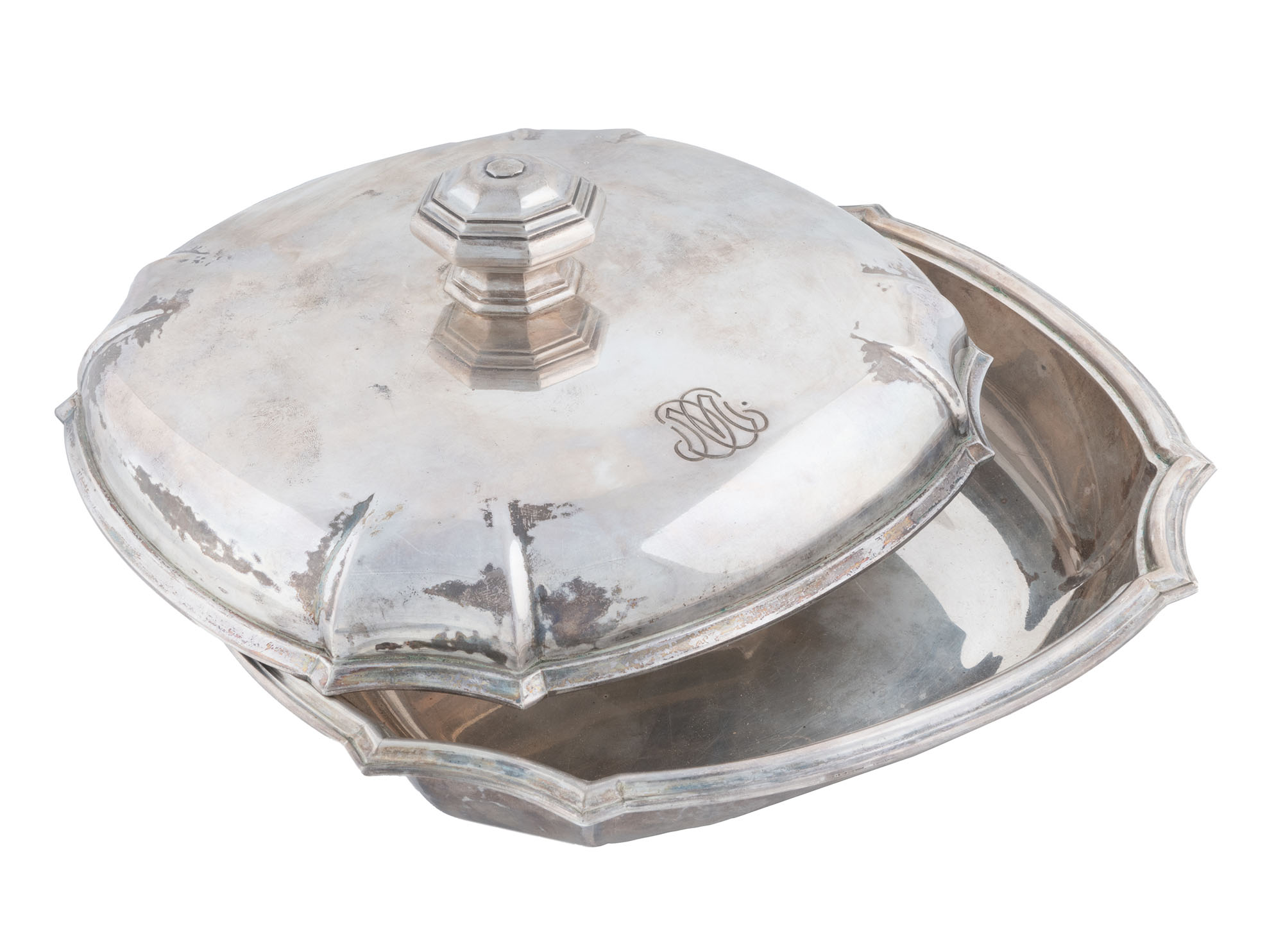 Puiforcat, Paris, Coppia di legumiere in argento con coperchio e monogramma De Marinis. 1940 ca.