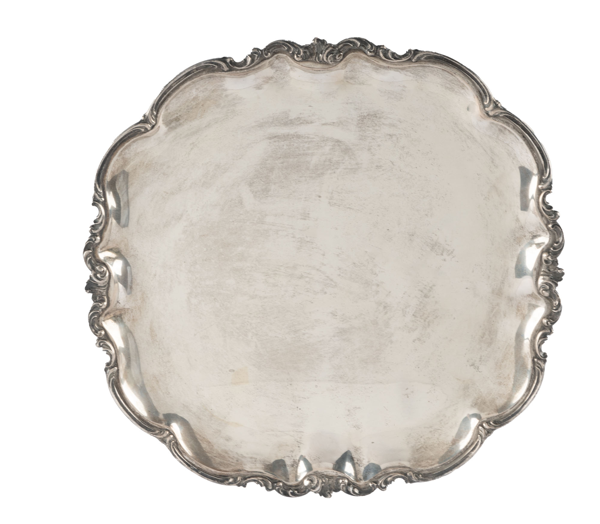 Italia, XX secolo, Piatto in argento con bordo mistilineo ed elementi decorativi. 1930-1950 ca. Piatto in argento con bordo mistilineo ed elementi decorativi. cm 34x34. gr. 800. Punzonato al verso sotto il bordo. (1)