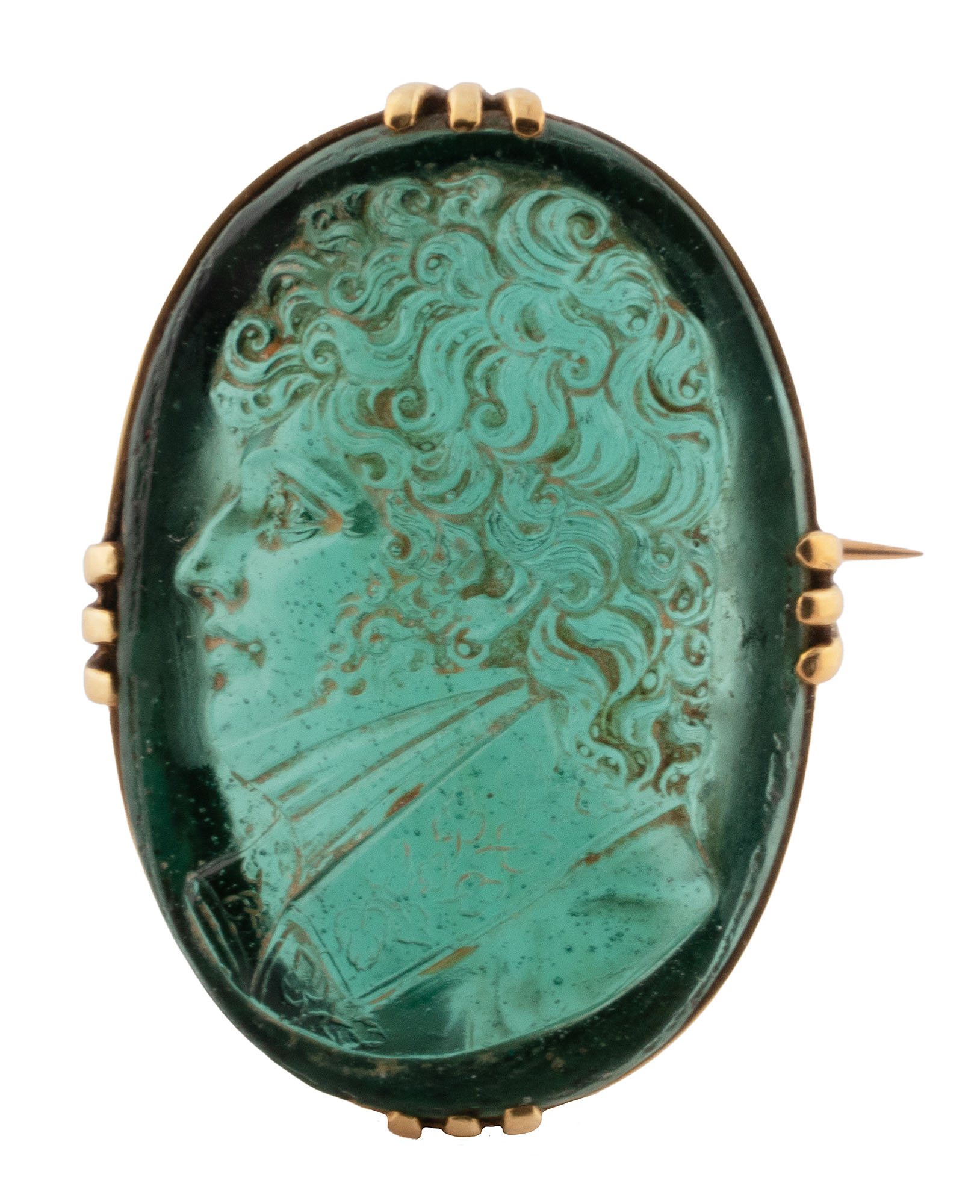 Spilla in oro 18 kt con cammeo raffigurante testa di Gioacchino Murat. Primo quarto XIX secolo. Spilla con cammeo in pietra verde raffigurante testa di Gioacchino Murat, montatura in oro 18 kt. cm 3,5x2,5. gr 18. (1)