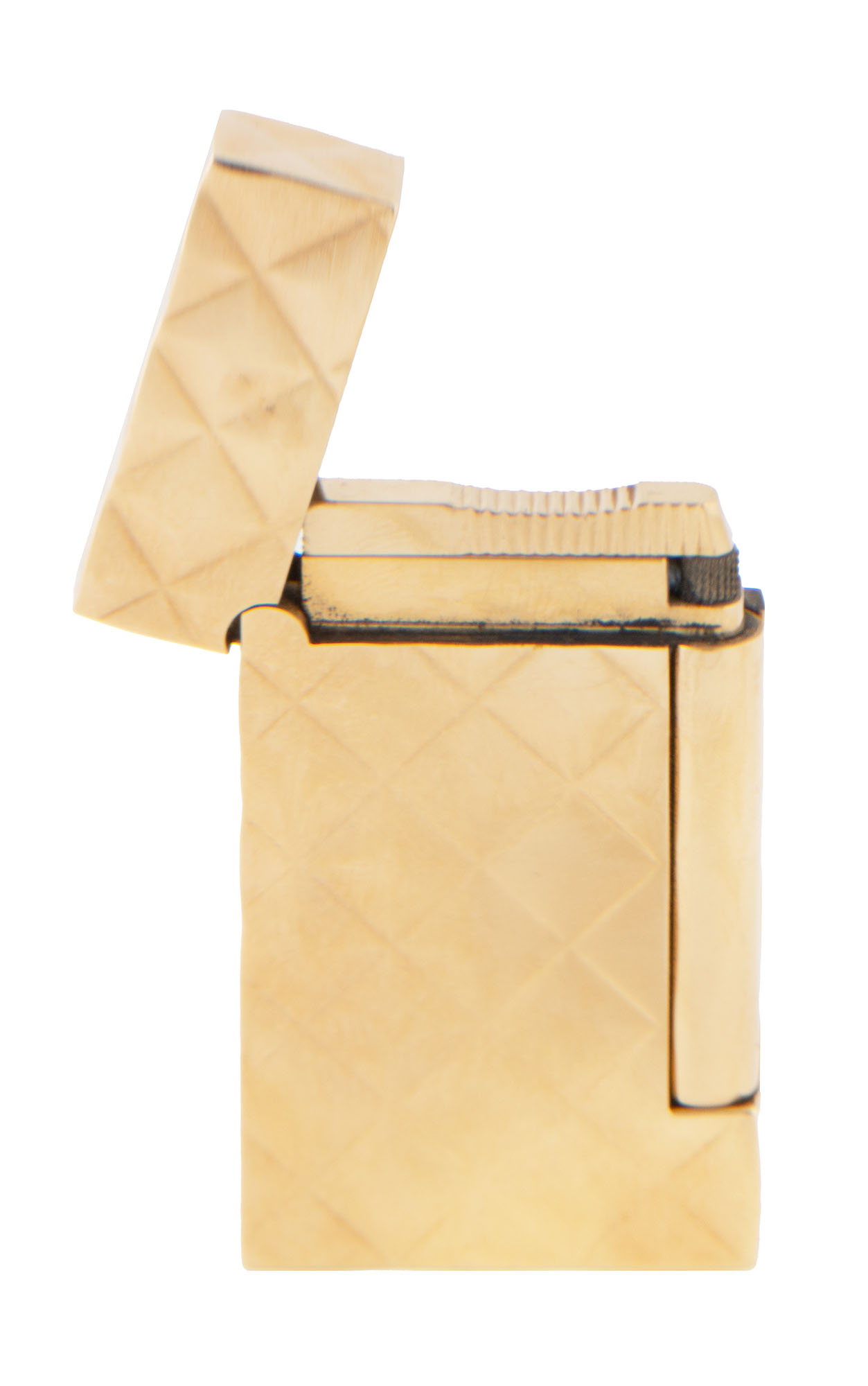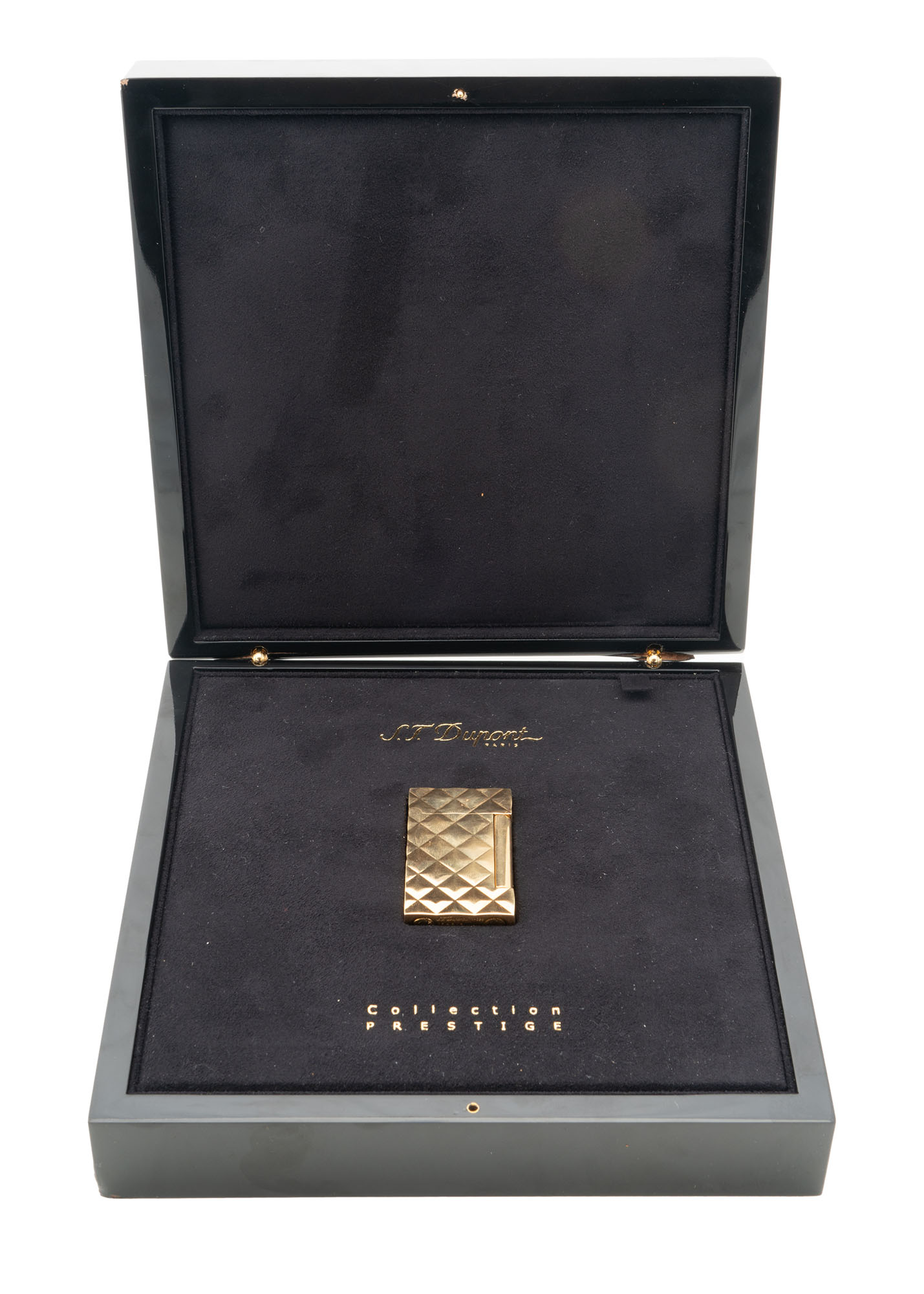 S.T. Dupont - Paris, Accendino placcato in oro S.T. Dupont - Collection Prestige. 2009. Accendino in oro-laiton 18 kt 750 con motivi a rombi. cm 5,5x3x2x1. g 119. "S.T. Dupont PARIS - Made in France" incisi sul fondo dell'oggetto insieme ai punzoni del metallo. "Collection PRESTIGE" inciso al lato. Conservato entro il proprio cofanetto in legno e la scatola contenitiva. Accompagnato sia dalla carta di garanzia datata 2009 che da piccolo opuscolo del produttore. Completo di porta-accendino da viaggio. (1)Il cofanetto in legno presenta alcune mancanze agli angoli inferiori, mentre la scatola contenitiva ha un cedimento ad uno dei lati. Accendino scarico ma funzionante, con trascurabili graffietti. Ottima conservazione complessiva.