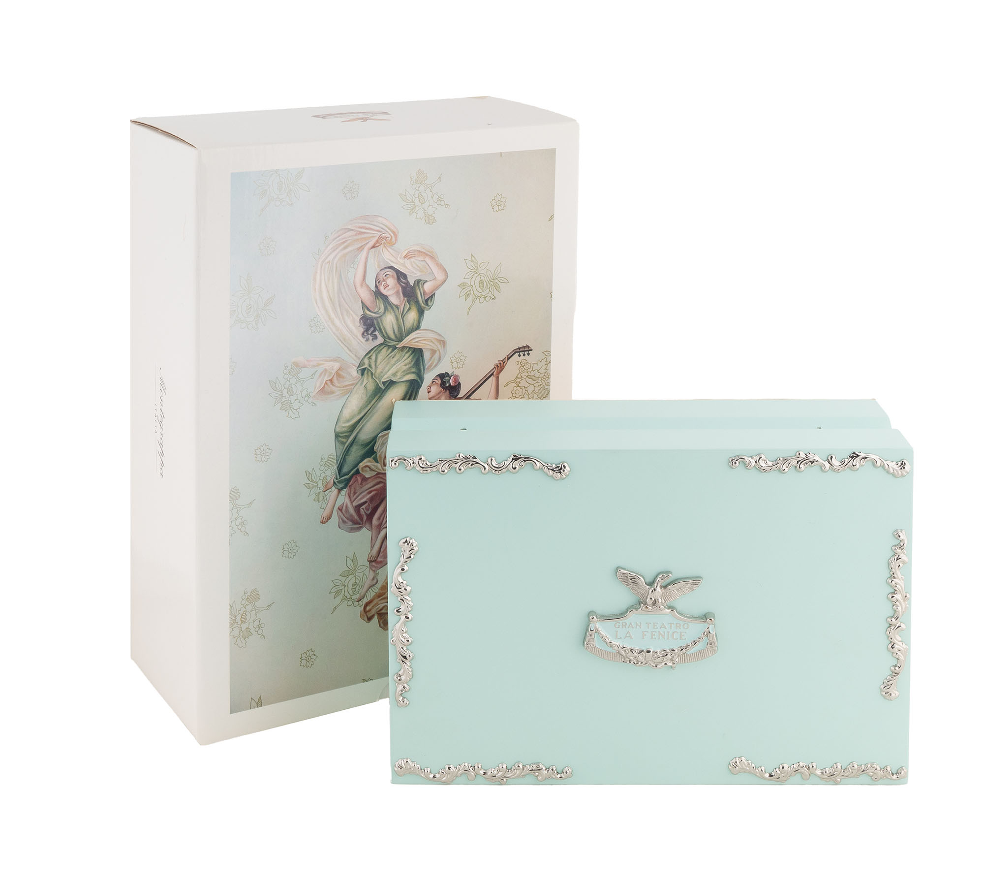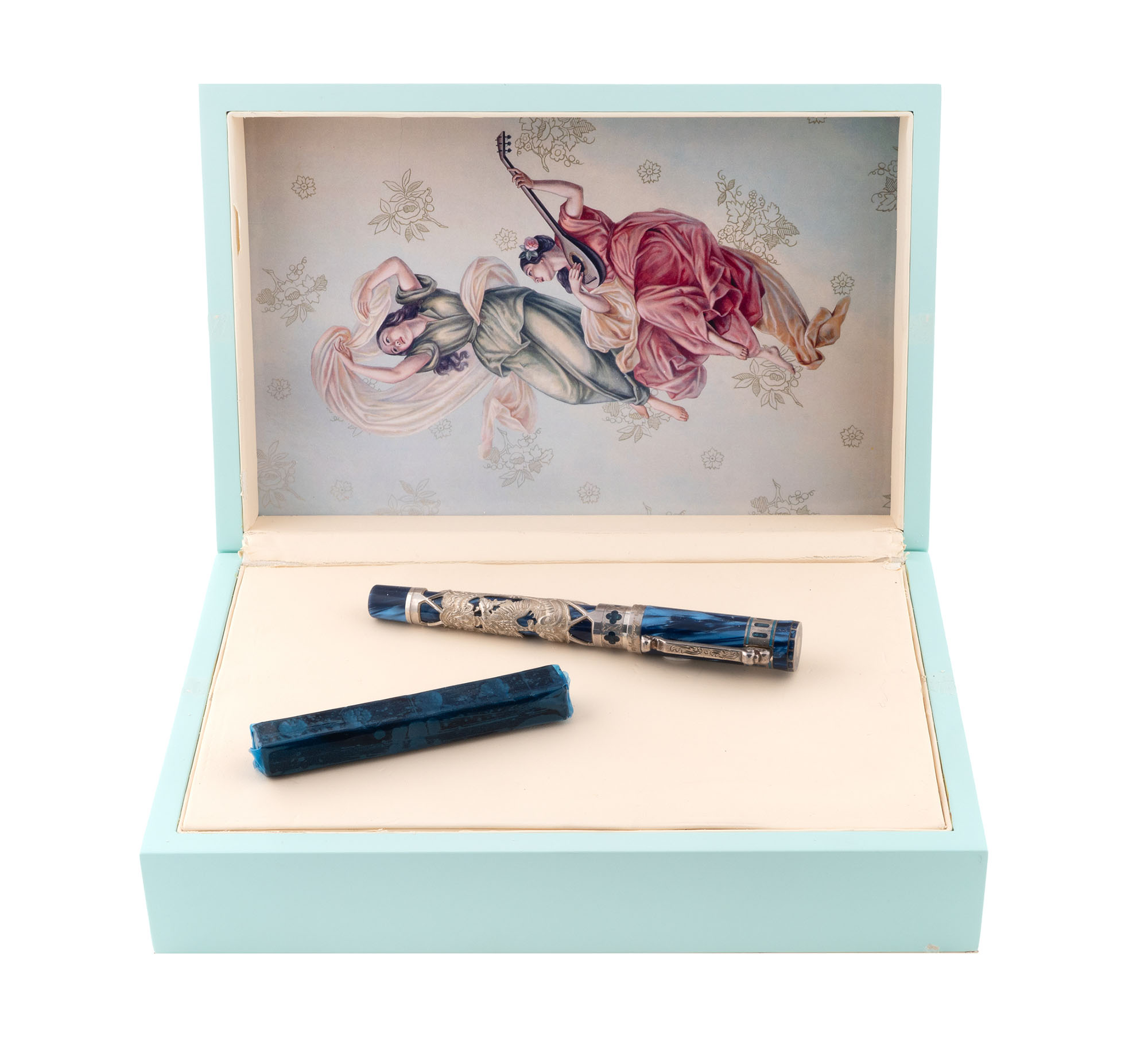 Montegrappa, Penna Montegrappa in argento massiccio - Edizione Gran Teatro La Fenice. 2010. Penna a fontana in resina e argento massiccio. cm 14,3. cm diam. 1,5. "Montegrappa" inciso sul bordo del tappo. Tiratura incisa sul fondo. Caratura incisa sulla punta della penna. Edizione limitata realizzata per i 220 anni dell'iconico Teatro La Fenice di Venezia. Opera completa di cofanetto con decori in rilievo, scatola contenitiva adornata e libretti illustrativi, compreso un certificato di autenticità contenente le indicazioni di tiratura. In aggiunta, nella confezione è presente un blocchetto di cera-lacca blu incartato. La produzione di questa edizione segue una numerazione specificatamente studiata per ripercorrere le orme storiche del teatro: 1000 esemplari stilografici in argento, 745 roller in argento, 27 stilografiche in oro 18 kt e 18 roller in oro 18kt. Nel 1790 l'architetto Giannantonio Selva vinse la gara per la progettazione dell'edificio, 27 furono i mesi necessari per demolire la vecchia struttura e 18 quelli per la costruzione della nuova. Questo esemplare è il numero 0034 della tiratura di 1000. (1)Una piccola sbavatura di inchiostro sul porta penna in pelle, altrimenti ottima conservazione.