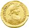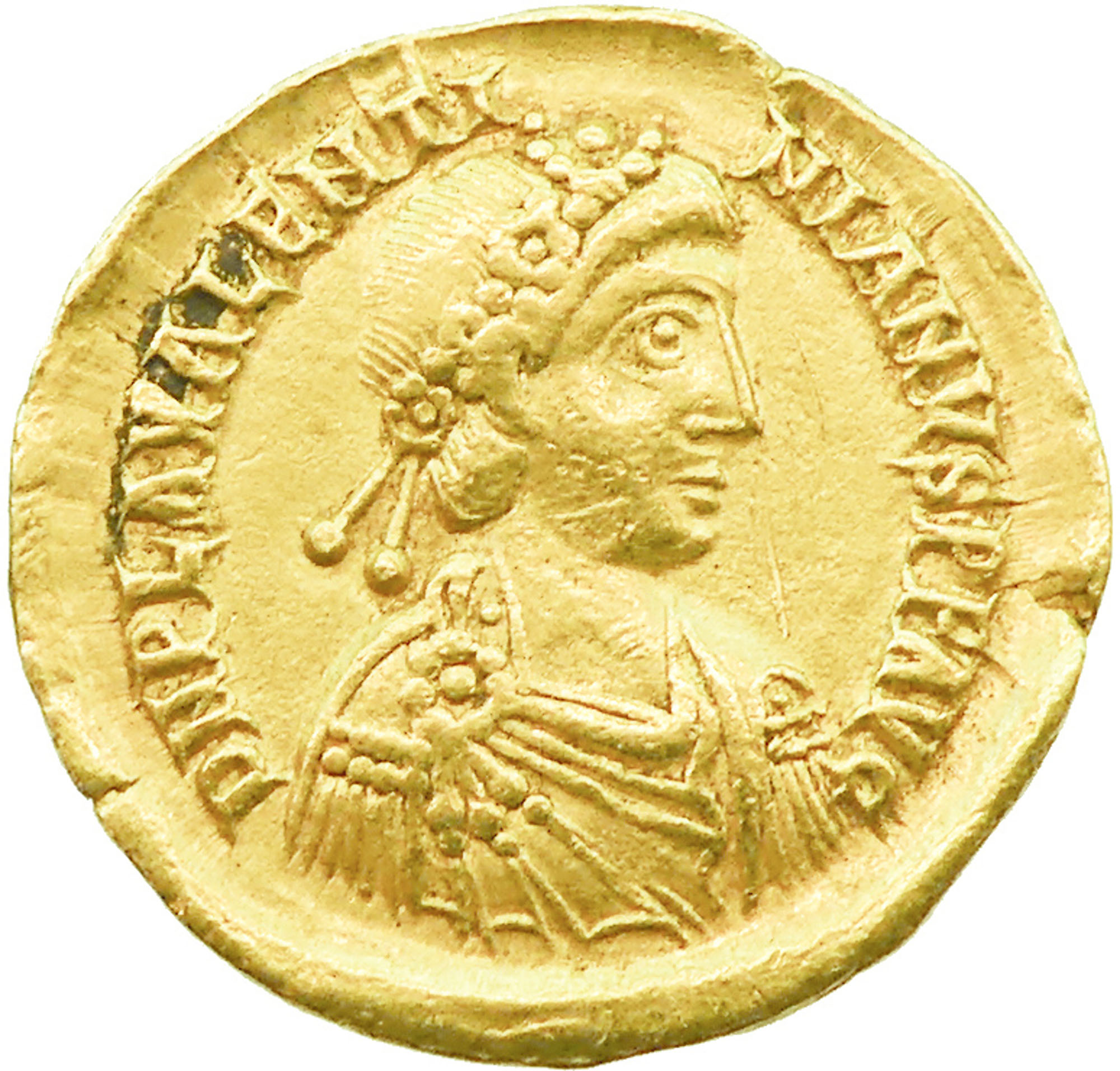Imperatore Valentiniano III. (419-455 d.C.). Solido zecca Ravenna. D: Busto paludato e corazzato di Valentiniano volto a dr. R: Valentiniano stante con un piede sulla testa di un serpente dal volto umano. Oro. mm 21,5. g 4,43. Conservazione: BB. (1)RIC, 19.