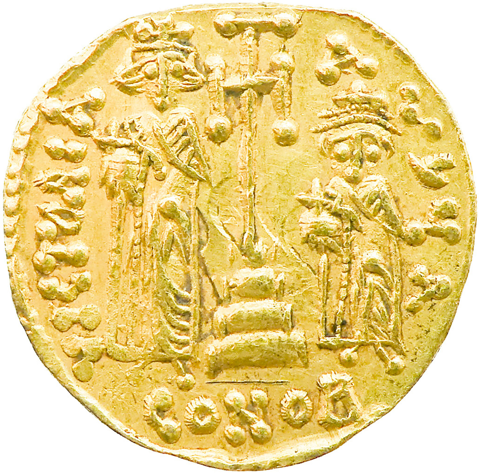 Costanzo II e Costantino IV. (659-668 d.C.). Costanzo II e Costantino IV. Solido. D: Busti affiancati dell'imperatore e del figlio R: I figli di Costanzo II Eraclio e Tiberio stanti. Oro. mm 18,5. g 4,39. Conservazione: BB. (1)Friedberg, 119.
