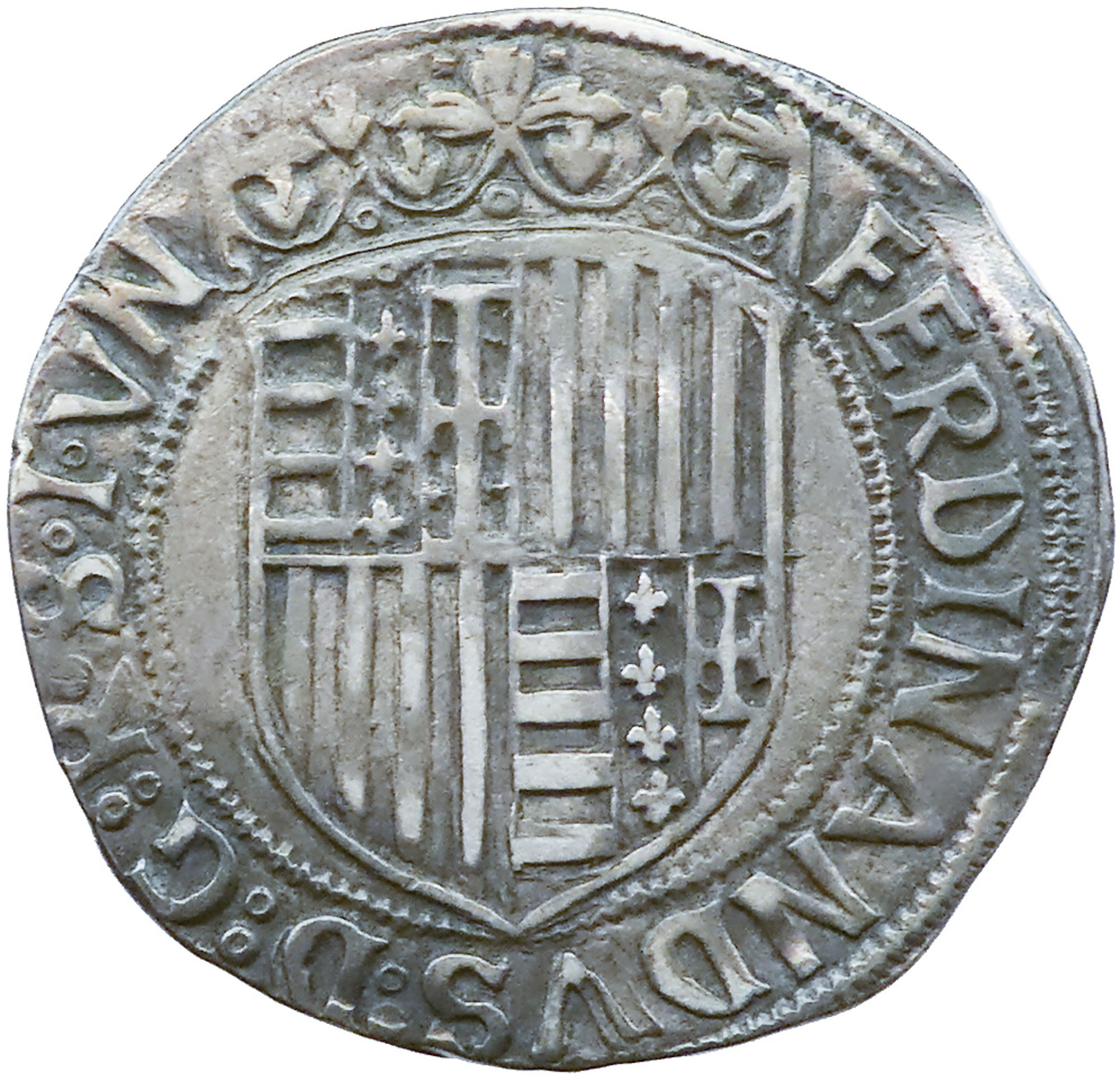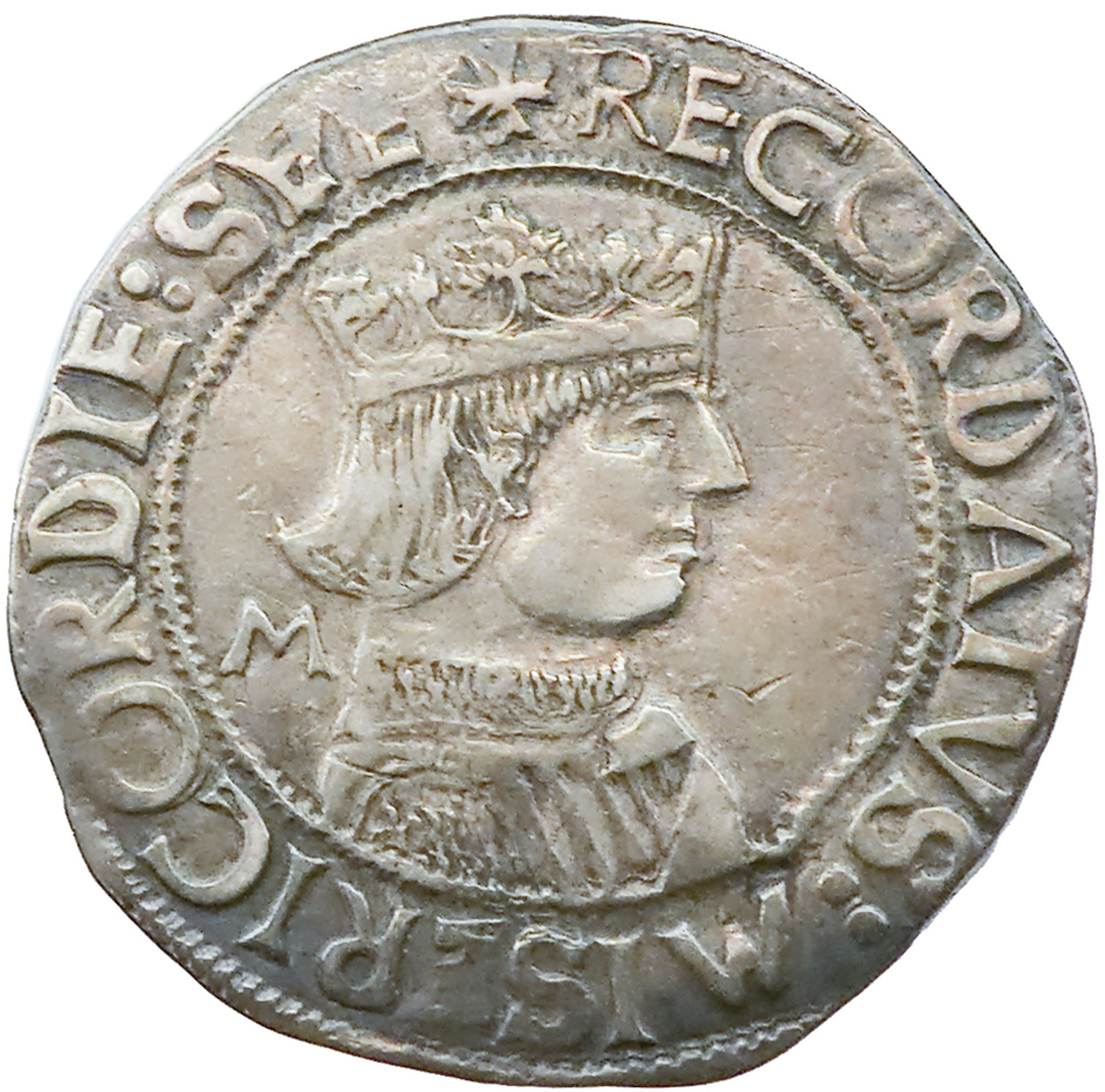 Napoli. Ferdinando I d’Aragona. (1458-1494). Tarì. D: Stemma inquartato. R: Busto di Ferdinando volto a dr., a sin. lettera M. Argento. mm 29. g 7,19. Conservazione: BB. Rarità: R3. (1)MIR, 65. Pannuti-Riccio, 10.