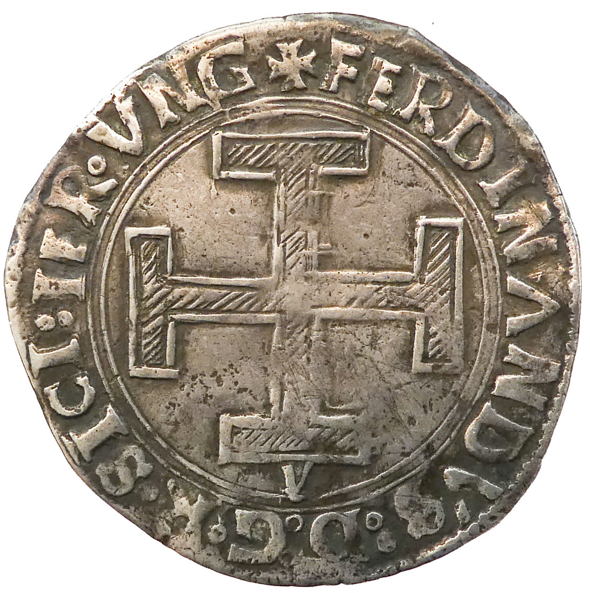 Napoli. Ferdinando I d’Aragona. (1458-1494). Coronato. D: Croce di Gerusalemme, sotto lettera Y. R: Scena dell'incoronazione di Ferdinando. Argento. mm 28,5. g 3,80. Conservazione: BB. Rarità: R2. (1)MIR, 66/6. Pannuti-Riccio 12d.