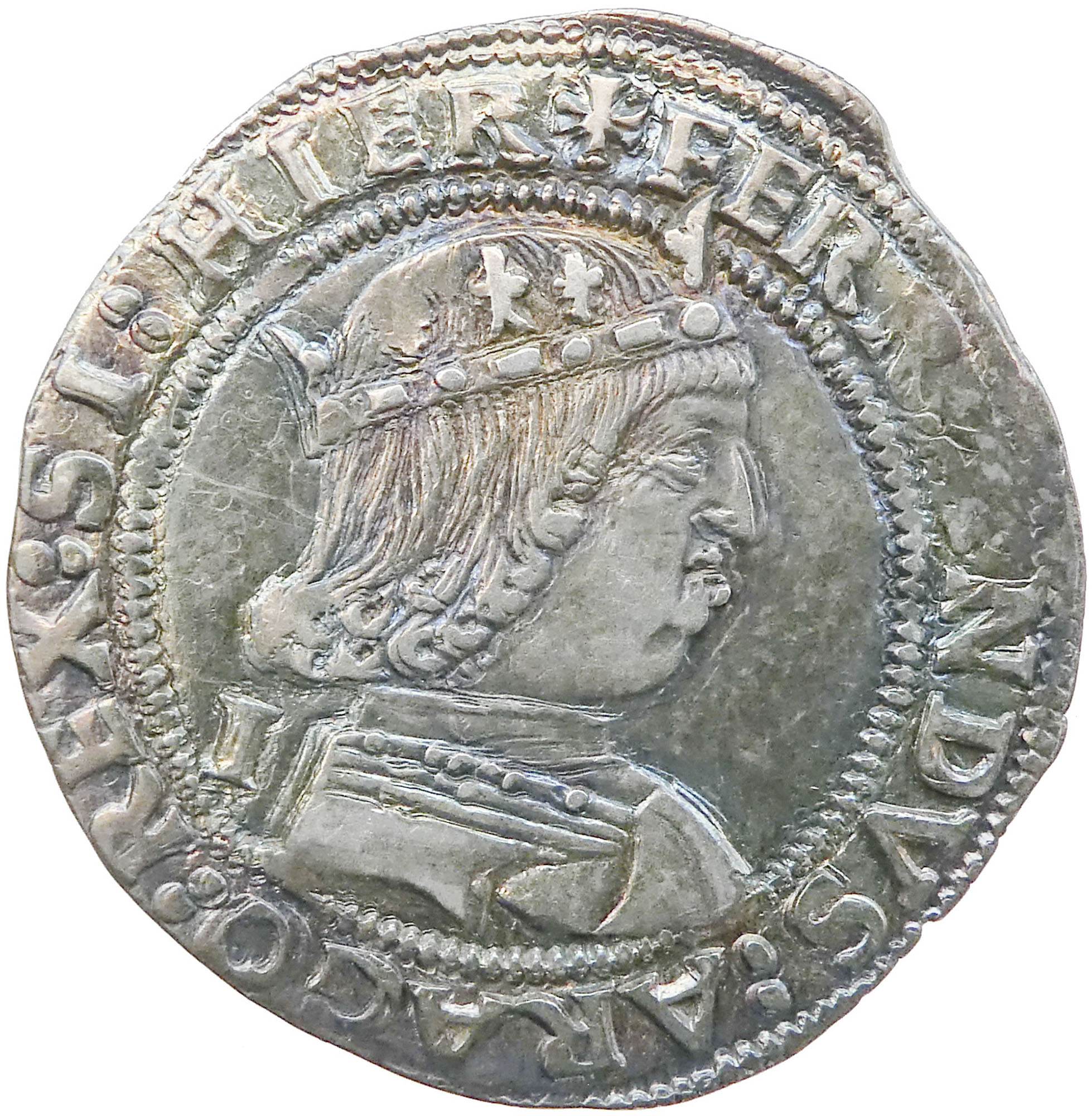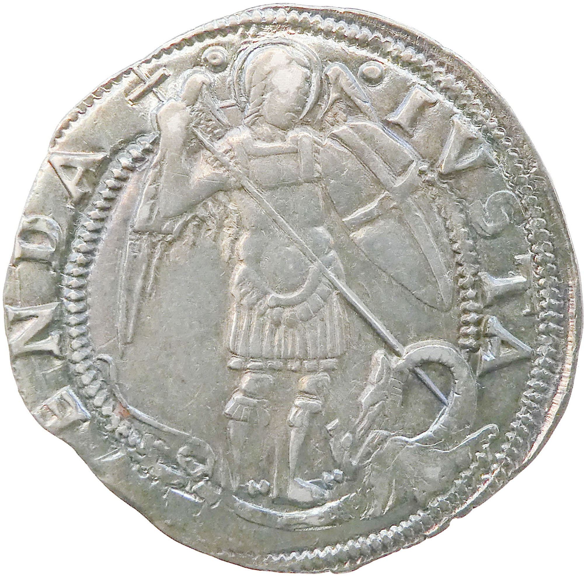 Napoli. Ferdinando I d’Aragona. (1458-1494). Coronato. D: Busto di Ferdinando volto a dr., a sin. lettera I. R: L'Arcangelo Gabriele che trafigge il drago. Argento. mm 26. g 3,99. Conservazione: BB. (1)MIR, 70/2. Pannuti-Riccio, 19.