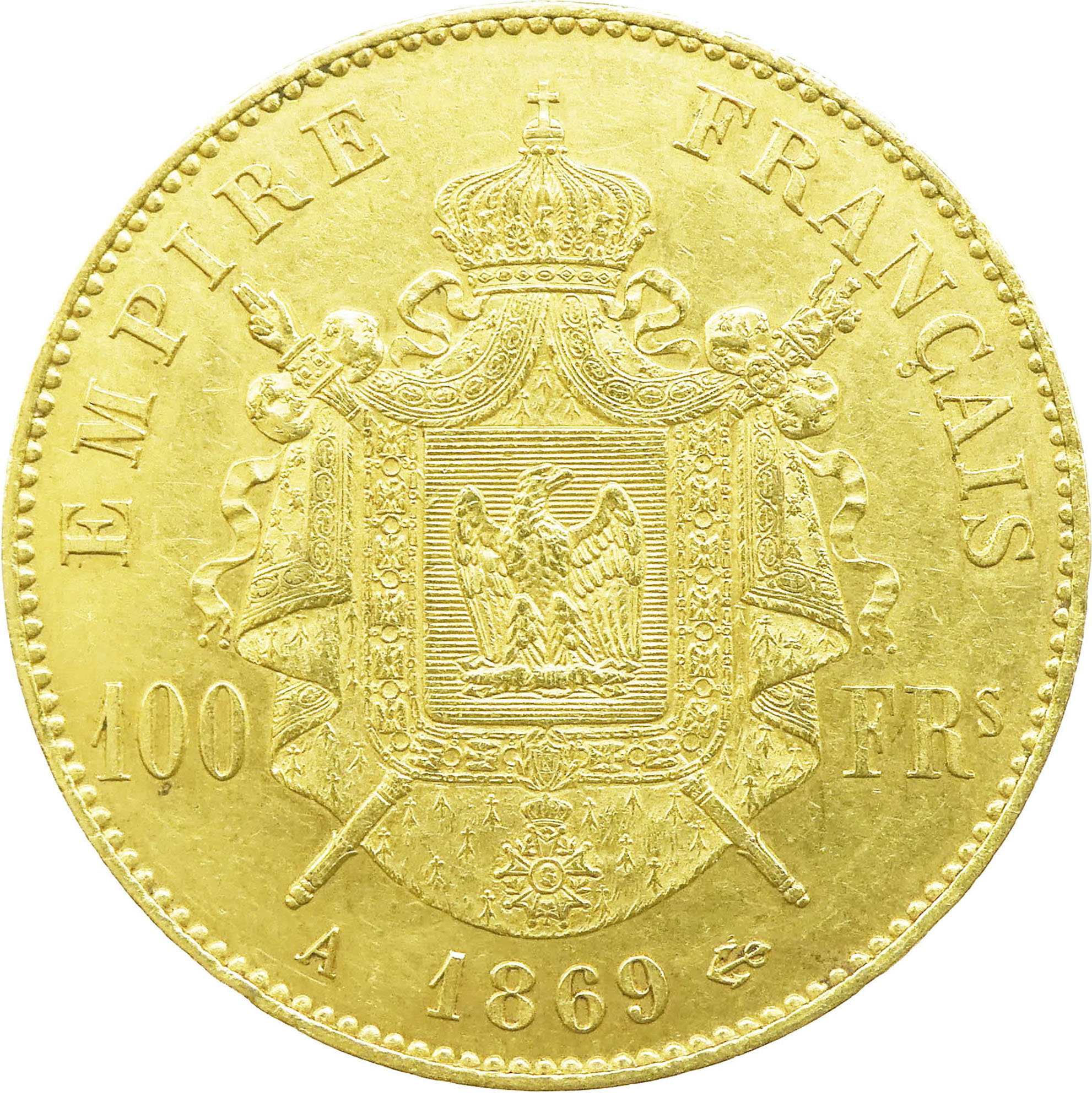Francia. Napoleone III. (1852-1870). 100 Franchi oro 1869. D: Testa volta a dr. R: Stemma. Oro. mm 35. g 32.20. Conservazione: q.SPL. (1)Friedberg, 580.