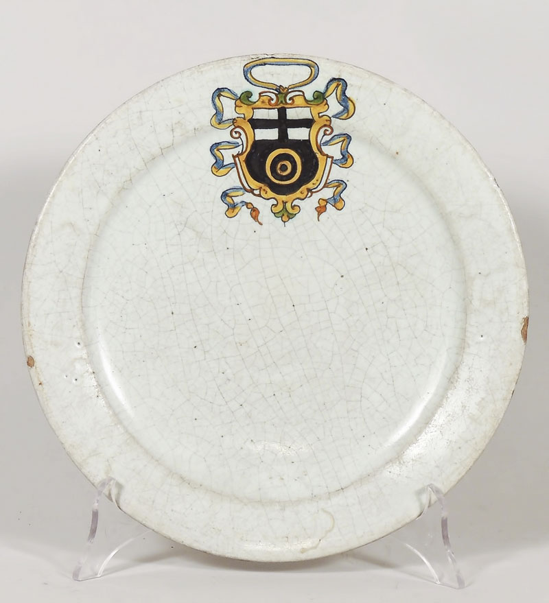 PIATTO IN MAIOLICA Italia Centrale, XVIII secolo dipinto con stemma gentilizio nei toni dell'ocra, celeste e nero, lievi difetti diam cm 25,5 MAJOLICA PLATE, CENTRAL ITALY, 18TH CENTURY