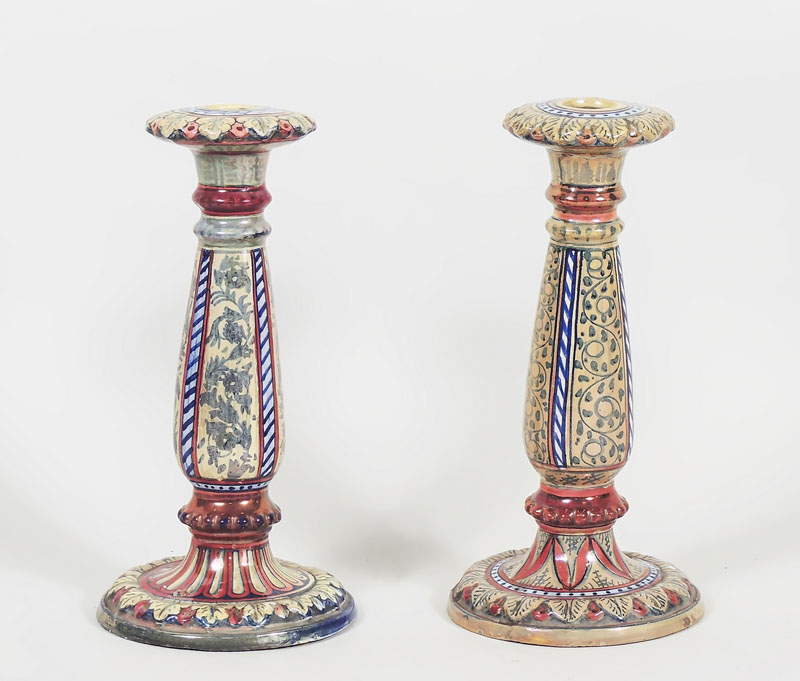 COPPIA DI CANDELIERI IN TERRACOTTA SMALTATA A LUSTRO Gualdo Tadino,...
